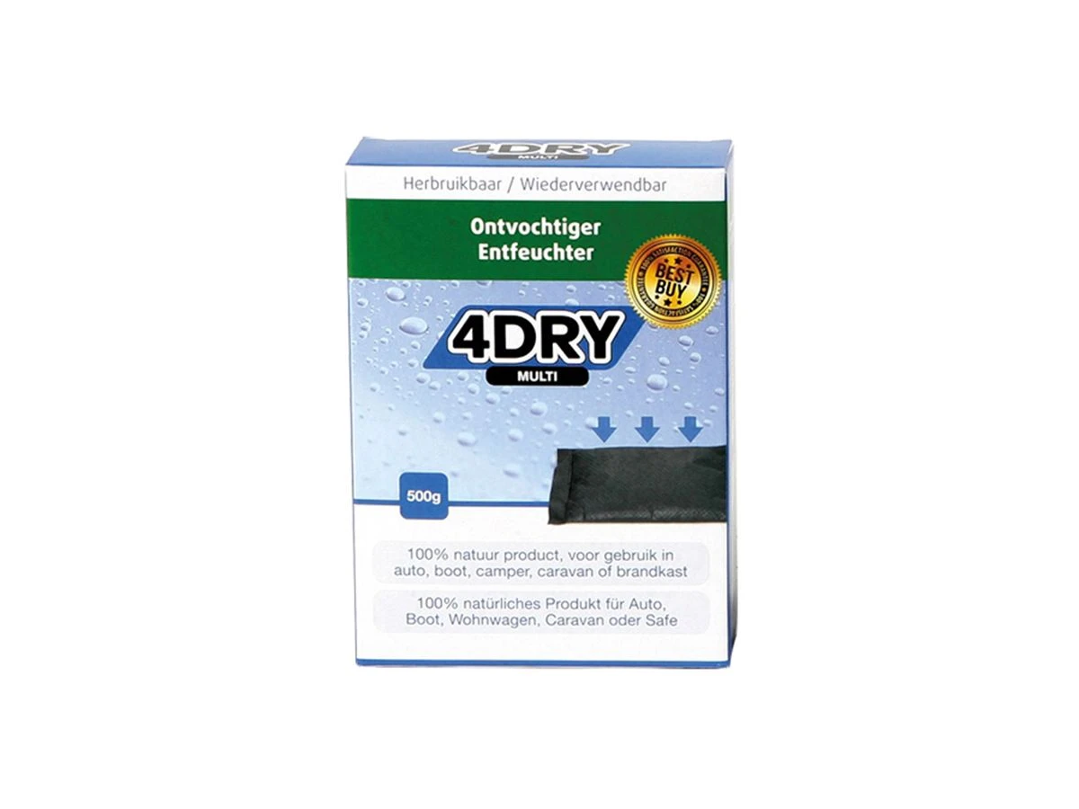 De 4Dry Multi-ontvochtiger is 100% natuurlijk, te gebruiken in auto, boot, camper, caravan of brandkast. Hij is eenvoudig in gebruik én herbruikbaar door regeneratie in de magnetron. De multi-ontvochtiger lekt niet, voelt niet vochtig aan en is daarnaast scheurvast en stofdicht.