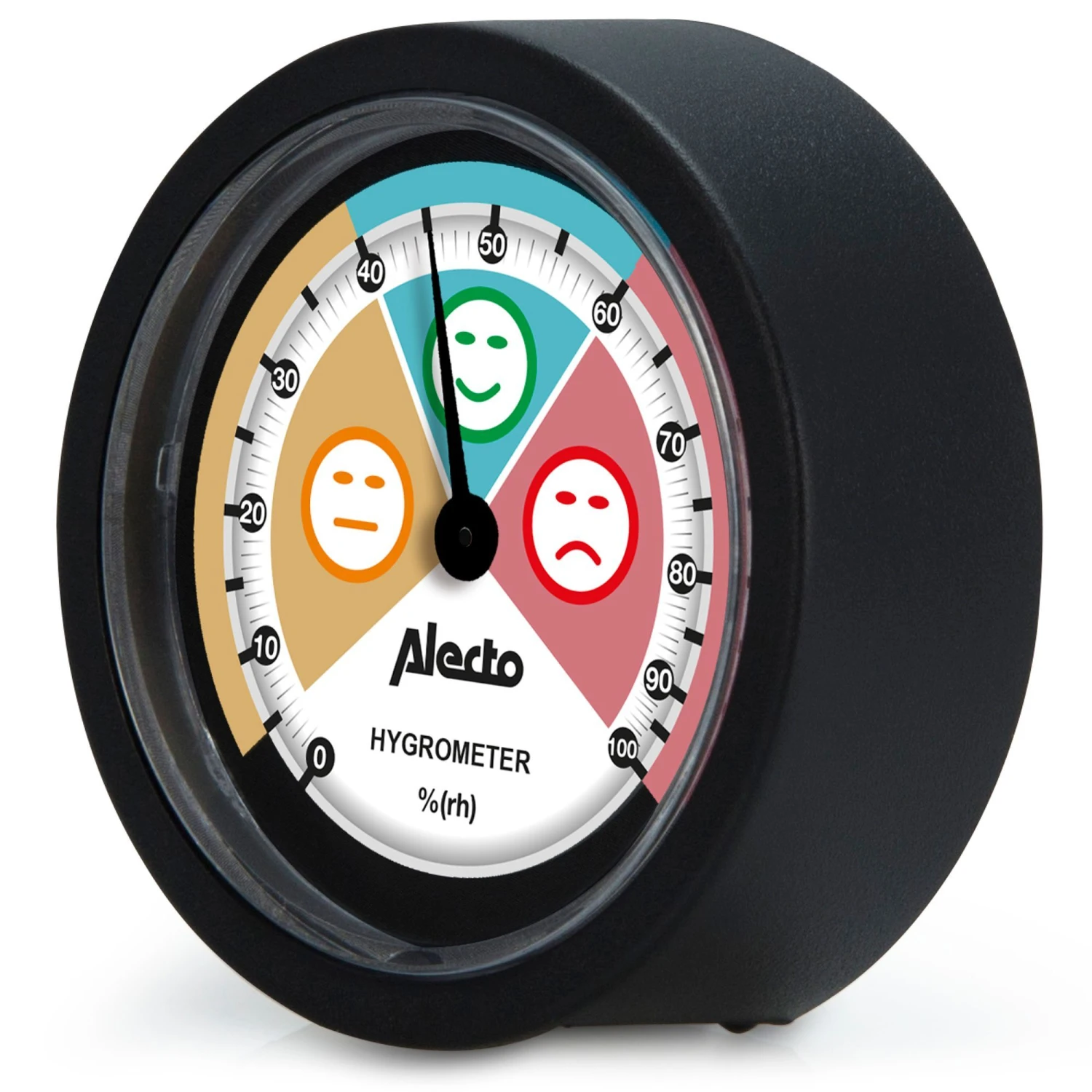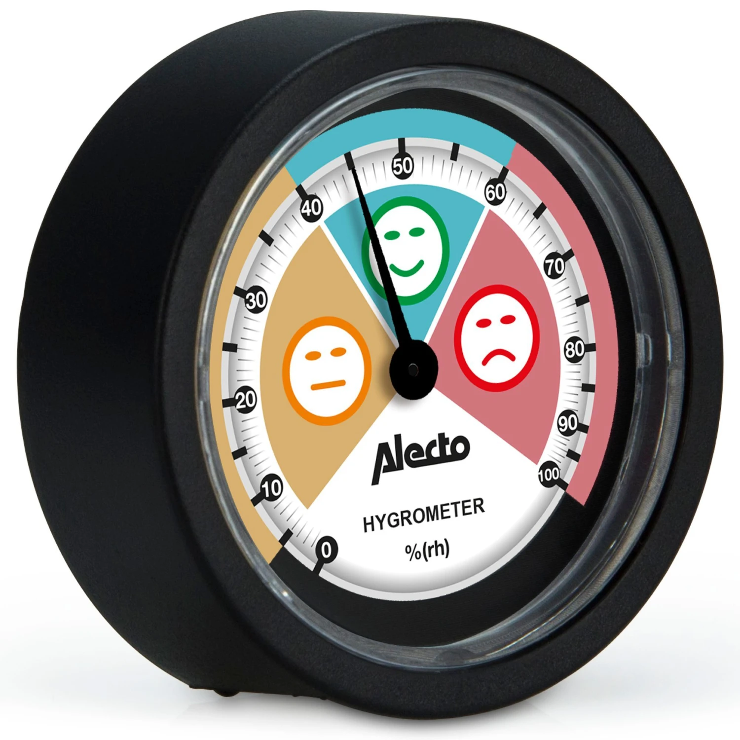Zoals een thermometer de temperatuur aangeeft, meet je met een hygrometerde relatieve luchtvochtigheidsgraad. Dit kun je voor iederegewenste ruimte binnenshuis afzonderlijk meten.Zo kun je er achter komen of, en zo ja, in welke mate, er sprake is van teveel of te weinig vocht.Eenhygrometergeeft de relatieve luchtvochtigheid aan in een percentage. Een waarde tussen 40 en 60 procent is goed.