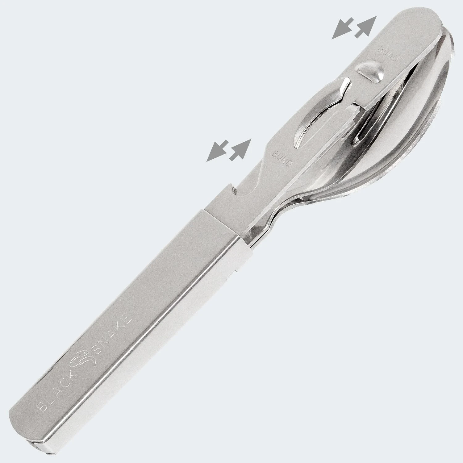 · Compact bestek bestaande uit mes, lepel, vork en blik- en flesopener