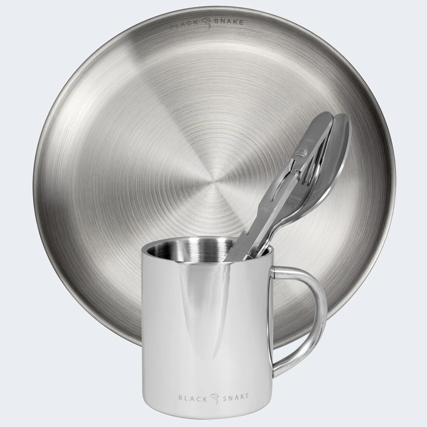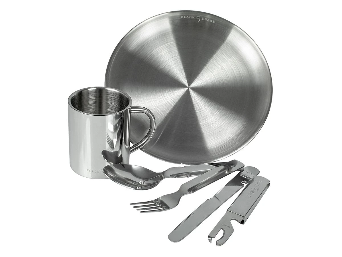 De klassiek mooie en hoogwaardige platte RVS platen zijn slijtvast en bijna onverwoestbaar. Het geborstelde oppervlak is gemakkelijk schoon te maken. Door zijn eigenschappen is dit type plaat ideaal voor kampeer-, wandel- of trektochten en andere buitenactiviteiten. Een geweldig en duurzaam alternatief voor plastic borden en dankzij het goede formaat van de dinerborden kan er tijdens het kamperen & Co van veel favoriete gerechten worden genoten. De set bevat praktisch kampeerbestek plus dubbelwandige geïsoleerde thermobekers. Het bestek in Bundeswehr-stijl is compact samen te stellen voor onderweg en de onbreekbare mok met handvat houdt je favoriete drankjes betrouwbaar warm.