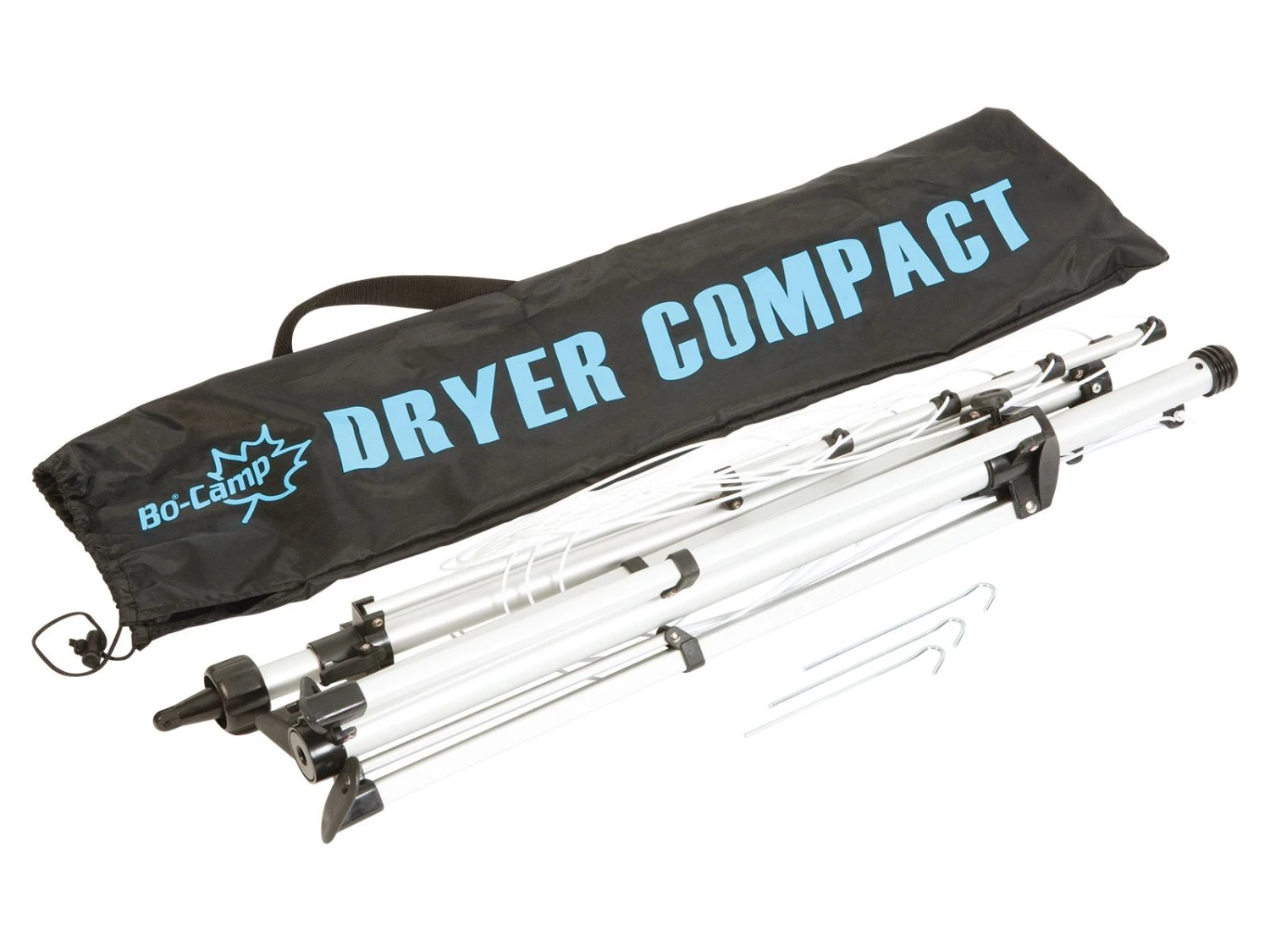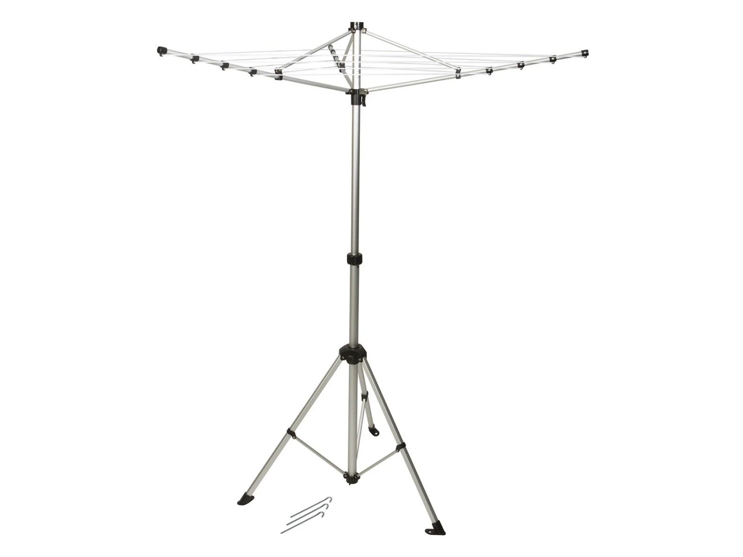 Deze droogmolen is ideaal voor op de camping en onderweg doordat hij zeer compact is in te vouwen. De droogmolen is in hoogte verstelbaar van 136 cm tot 185 cm en wordt geleverd met 3 haringen om de droogmolen vast aan de grond te zetten.