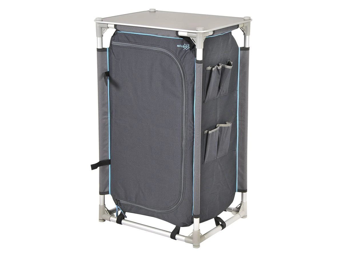 De Bo-Camp kast heeft een lichtgewicht aluminium frame met een polyester bekleding. Zowel het bovenblad als de legplanken zijn gemaakt van MDF en afgewerkt met een aluminium rand.