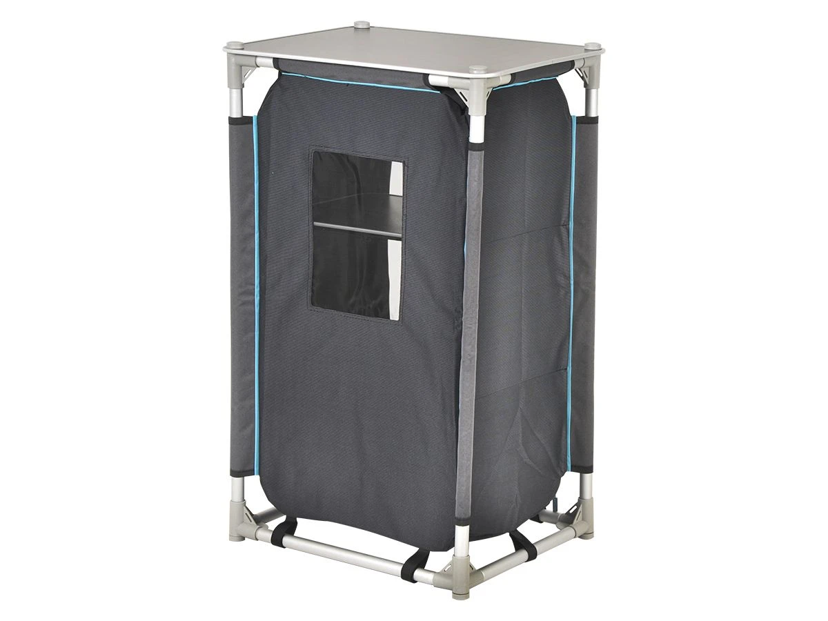De kast is voorzien van vier verstelbare poten zodat je de kast altijd waterpas kunt zetten op een ongelijke ondergrond. Zodra de vakantie afgelopen is kun je de kast eenvoudig uit elkaar halen en opbergen in de meegeleverde draagtas.