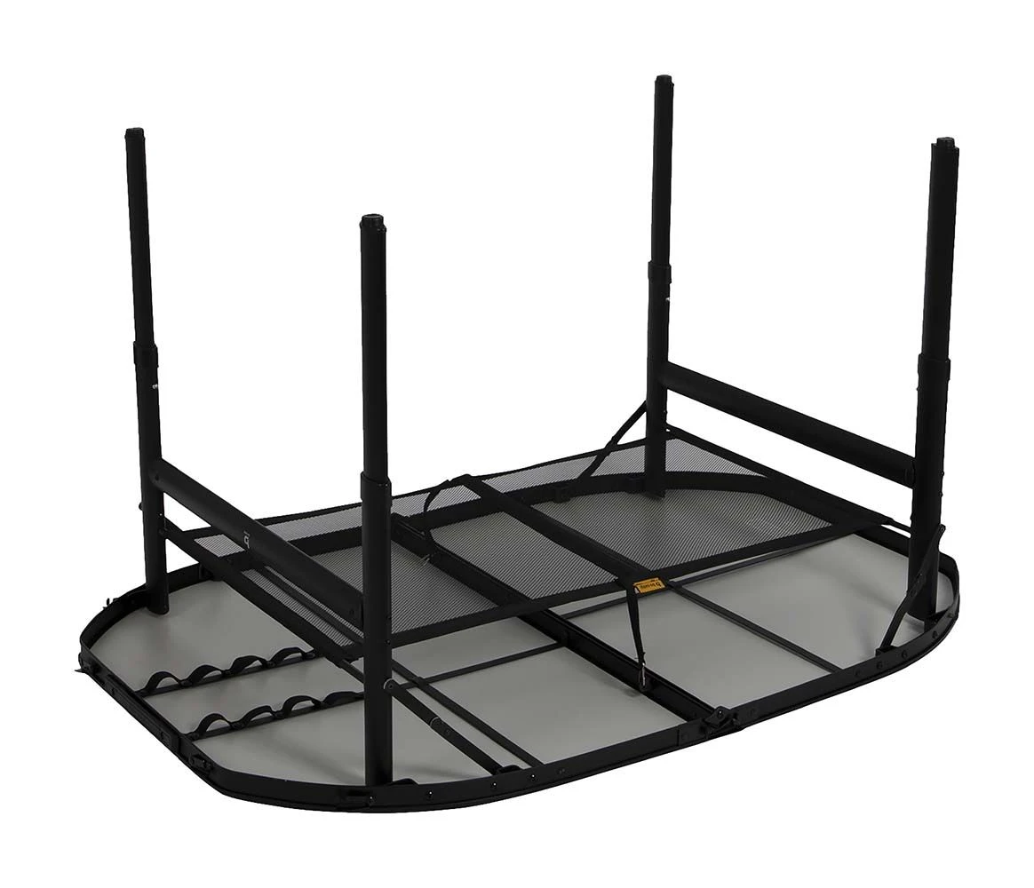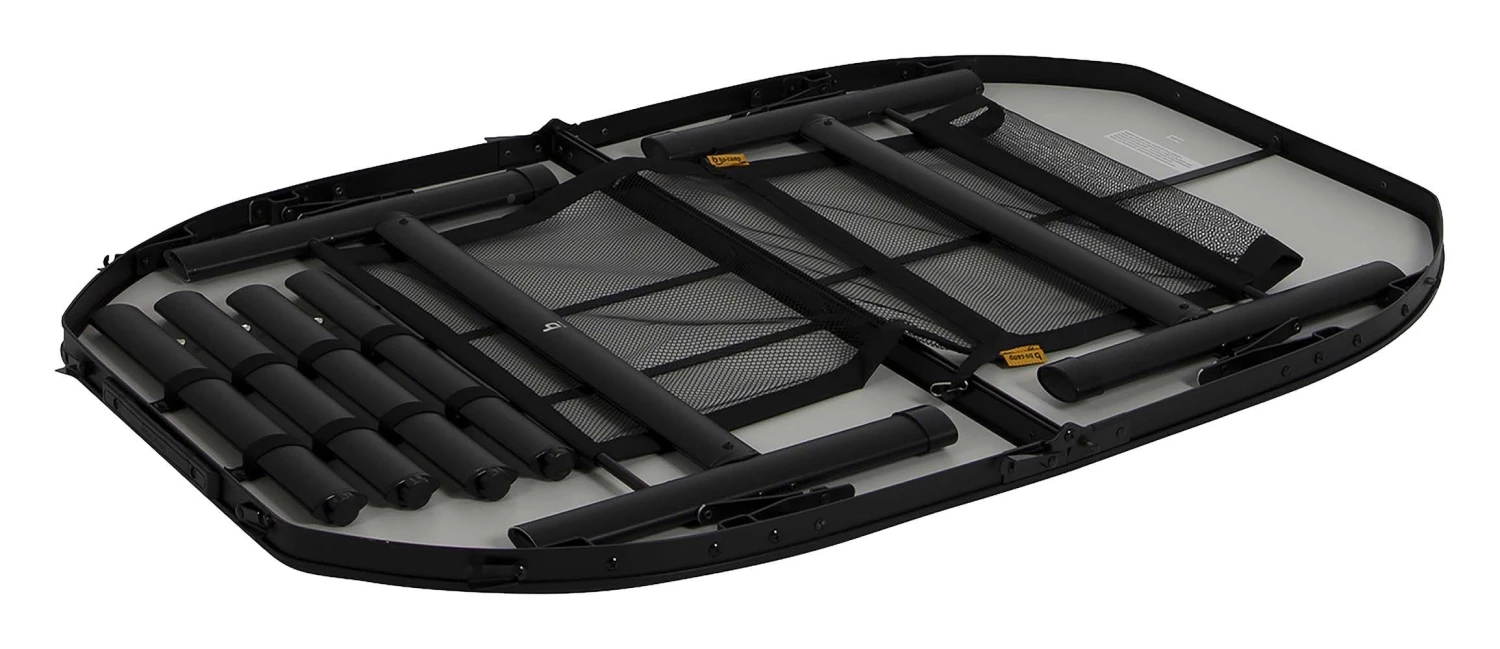 Een stijlvolle ovale aluminium tafel met een industriële uitstraling en betonlook tafelblad. Door middel van stelschroeven zijn de tafelpoten af te stellen op een ongelijke ondergrond. Daarnaast is de tafel zeer compact als koffermodel op te bergen door de afneembare poten en een deelbaar blad. Bovendien is de tafel voorzien van een net onder het MDF tafelblad om spullen in op te bergen, en een handgreep waardoor de tafel gemakkelijk is mee te nemen. De tafel is in hoogte verstelbaar: 36/70 cm.