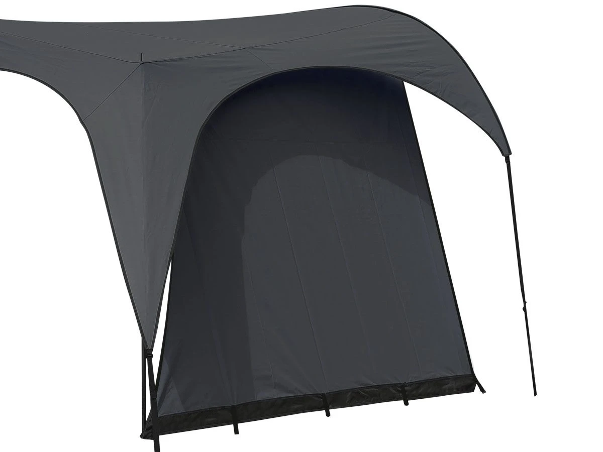 Deze handige zijwand kan zowel aan de linker- als rechterzijde van de Travelling luifel bevestigd worden. Aan de bovenzijde zitten handige haken waarmee de zijwand aan de ligger van het luifelframe bevestigd kan worden. Aan de onderzijde kun je de zijwand vastzetten met haringen.