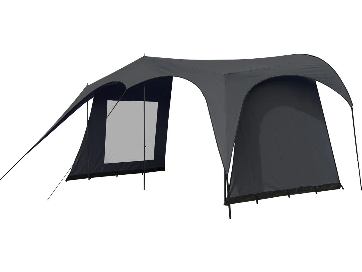 Deze handige zijwand kan zowel aan de linker- als rechterzijde van de Trekking luifel bevestigd worden. Aan de bovenzijde zitten handige haken waarmee de zijwand aan de ligger van het luifelframe bevestigd kan worden. Aan de onderzijde kun je de zijwand vastzetten met haringen.