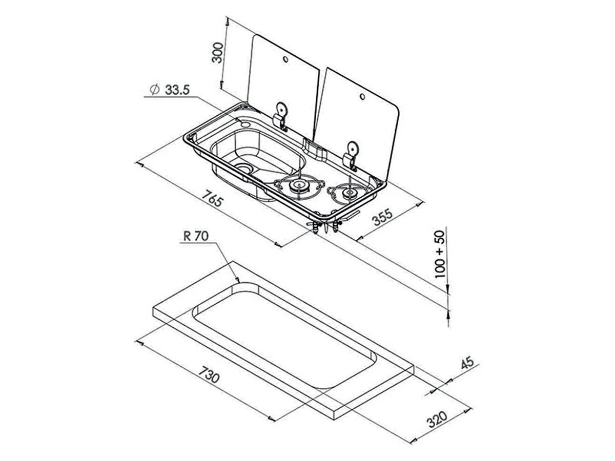 De CAN 2 pits kook-spoelcombinatie is leverbaar in twee modellen. Dit is de uitvoering met de wasbak aan de linkerzijde.