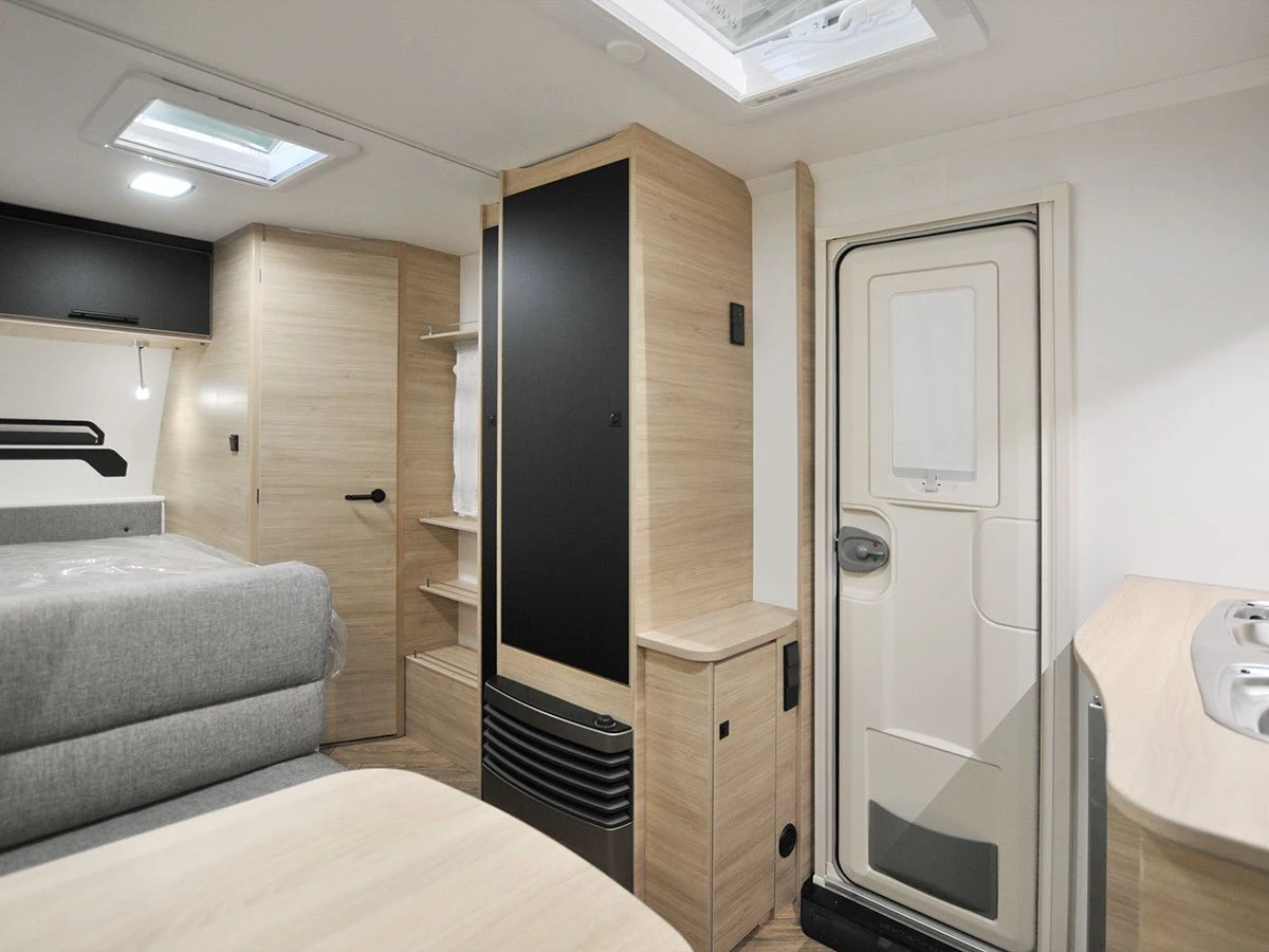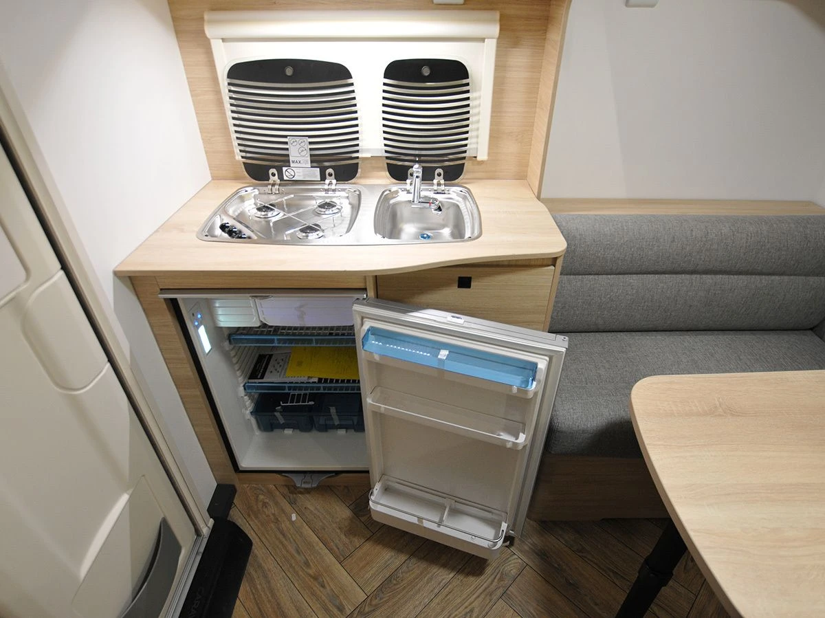 Naast de treinzit is de keuken geplaatst. In deze achterkeuken vindt u een Compressor koelkast van 140 liter , een 3-pits kooktoestel en spoelbak uit RVS met een glazen afdek voor meer werkruimte. Naast het frans bed loopt u de toiletruimte in. Deze ruimte is voorzien van een douchekolom, handdouche, douchegordijn en een elektrisch cassettetoilet.