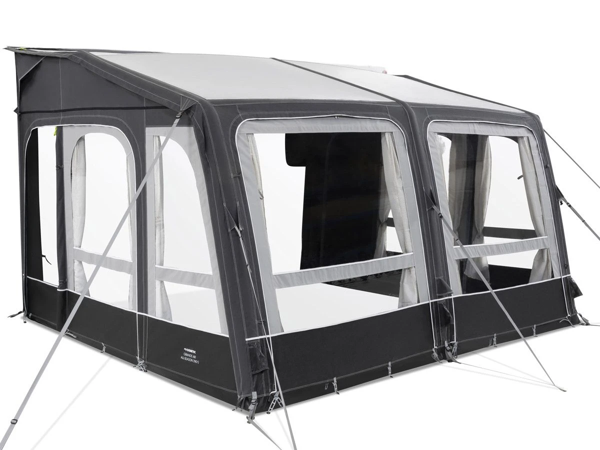 De Grande Air All-Season 390 S is uit te breiden met diverse accessoires, zoals bijv. een aanbouw, tenttapijt en set horrengaaspanelen voor extra ventilatie.