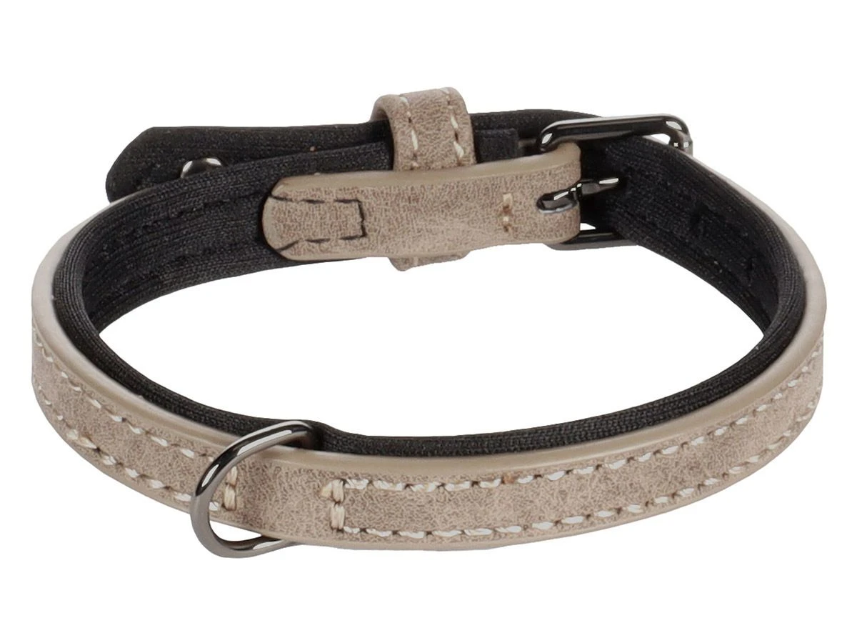 Gemaakt van hoogwaardig kunstleder en voorzien van een zachte neopreen voering, biedt deze halsband optimaal draagcomfort, zelfs tijdens langere wandelingen. De subtiele taupekleur geeft een chique uitstraling, terwijl de donkergrijze metalen gesp en D-ring zorgen voor een moderne en elegante afwerking.