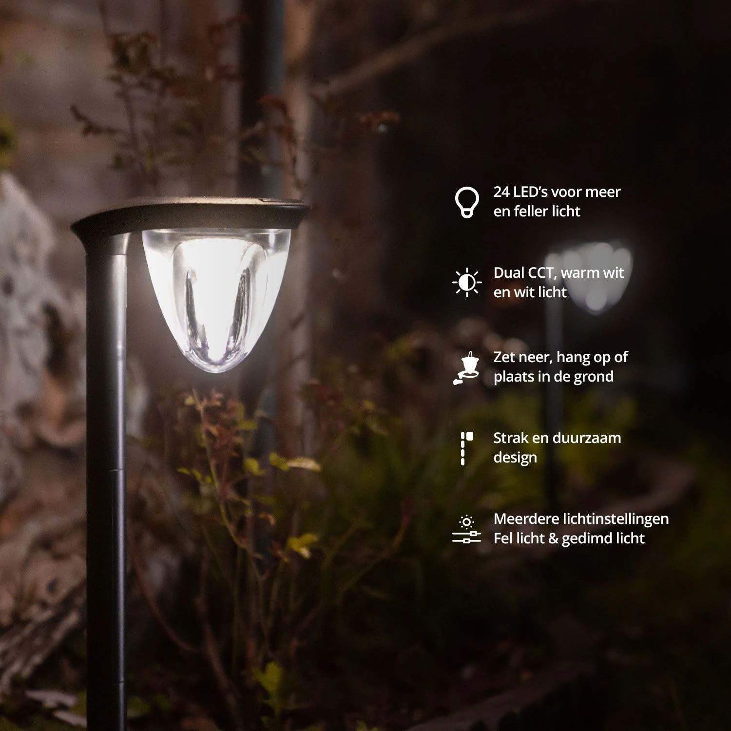 Met het FlinQ Solar Tuinlamp Juno 2-pack kies je voor twee zuinige en duurzame lampen voor in de tuin. Deze gezellige lampen met een hoogte van 70cm hoef je maar een keer te installeren op jouw favoriete plek in de tuin en daarna doet de natuur het volledige werk. Het zonnepaneel bovenop de lamp vangt het zonlicht op en zet dit om in de energie voor de lamp. Er komt dus geen batterij of stekker meer aan te pas! De Juno solar tuinverlichting is multifunctioneel, dat wilt zeggen dat je er op veel manier gebruik van kunt maken. Jouw voordelen Werkt 365 dagen per jaar GEEN Energiekosten Solar lamp klaar voor meervoudig gebruik Te bevestigen aan muur of schutting of in de tuin zelf, of als losse lantaarn te gebruiken Twee verschillende lichtsterktes mogelijk, naar eigen voorkeur in te stellen Monocrystalline solar paneel, hoge efficiëntie van omzetten zonlicht Met slimme light sensor, gaat aan in het donker en uit als het licht is Bespaar op je energierekening, GEEN energiekosten! Je hebt geen elektriciteit of batterijen meer nodig om de ruimte rond je huis of pand te verlichten. De lamp heeft geen rechtstreeks zonlicht nodig en werkt zelfs bij koude winterdagen. Sterker nog, deze lamp werkt 365 dagen per jaar! Twee sterktes Het tuinlicht van lamp Juno is aan te passen naar twee verschillende sterktes. Kies voor het witte licht (6000K) voor een helder zicht op je tuin of schuur. Of kies voor het gezellige warmwitte licht (3000K) als je juist een sfeervolle avond tegemoet gaat. Daarnaast is het licht van de Juno dimbaar. Je kunt bij beide lichtsoorten kiezen voor 50% of 100% sterkte. Multifunctioneel De tuinlampen zijn op verschillende manieren te gebruiken. Je kunt er bijvoorbeeld voor kiezen om de lamp aan de muur, de schutting of in de boom op te hangen. Heb je meer aan een grondspot langs het tuinpad bijvoorbeeld? Ook daar is de tuinlamp voor geschikt! Omdat de tuinlamp bestaat uit verschillende onderdelen, kun je deze net zo hoog maken als je zelf wilt. De lamp zelf is ontkoppelbaar, en daardoor ook als lantaarn in te zetten. Met bewegingsensor De lamp is voorzien van een slimme light sensor. Dat betekent dat licht nooit zonder functie aan zal staan. De sensor herkent het moment dat het donker wordt en zal dan de lamp inschakelen. Zodra het licht wordt, schakelt de lamp weer uit. Zo verbruikt de lamp dus nooit te veel energie. Bovendien werkt de solar tuinlamp met bewegingssensor ook nog eens inbraakpreventief. Dieven houden absoluut niet van goed verlichte plekjes. Verpakkingsinhoud FlinQ Juno (2x) Handleiding Specificaties Solar paneel: 6V 1.5W – doorsnede 110mm Lichtkleur: Wit licht 6000K – Warmwit licht 3000K Lichthoek: 120 graden Oplaadtijd: 8 uur Materiaal: ABS + PC Kleur: Zwart Lumens: 500 lm bij hoge helderheid – 250 lm bij lage helderheid