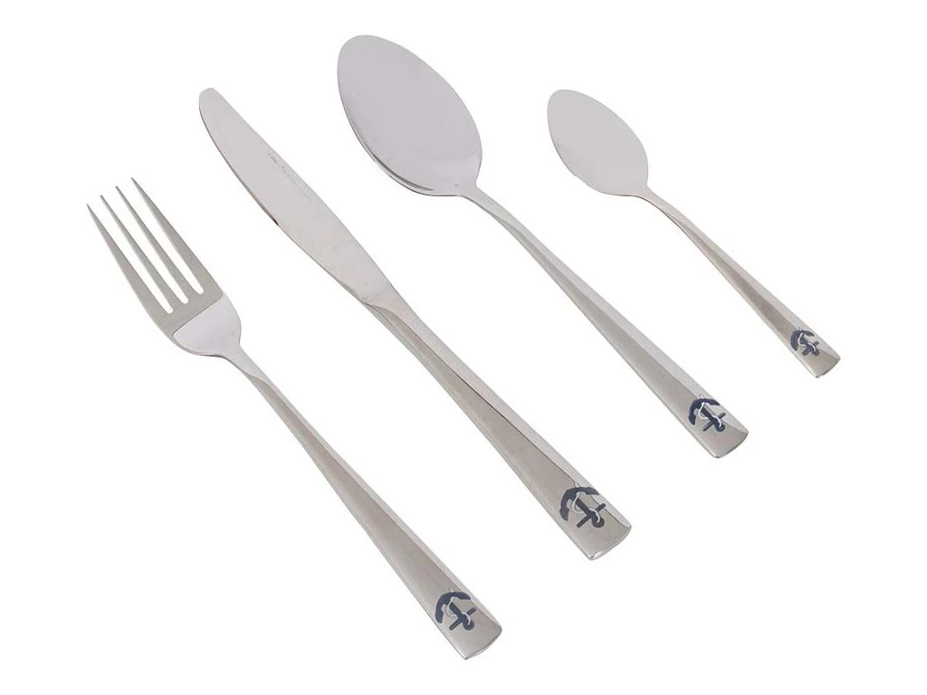 Een stijlvolle bestekset van RVS uit de Marine line collectie. Het bestek heeft een zilveren kleur en een klein anker accent op het heft. De set bestaat uit 4x een mes, vork, lepel en theelepel en is bovendien geschikt voor in de vaatwasser. Afmetingen: vork 20 cm, mes 23 cm, lepel 20 cm, theelepel 14,5 cm.