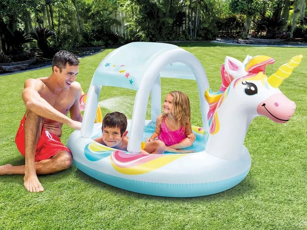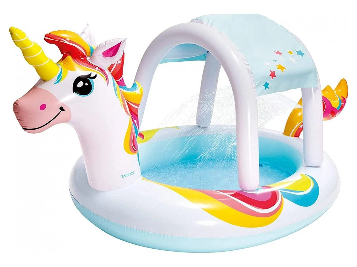 Wil je jouw kinderen ook wat waterplezier geven tijdens warme dagen? Kies dan voor dit eenhoorn kinderzwembad! De leuke vormgeving, het dakje dat een fijne schaduwrijke plek geeft en de staart van de unicorn die als sproeier gebruikt kan worden maakt dit zwembad de leukste zomeractiviteit voor jonge kinderen.