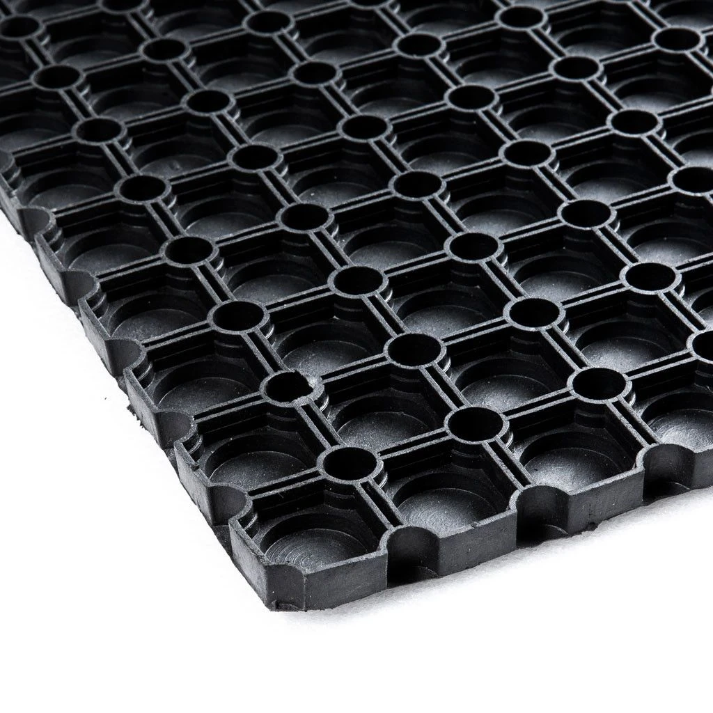 Een ringmat is zowel binnen als buiten te gebruiken. De gesloten bodem voorkomt dat vloeistoffen en vuil op de ondervloer terecht komen. Dat is niet alleen praktisch bij je entree, maar ook veilig op plaatsen waar veel met vloeistoffen gewerkt wordt. Doordat de mat van natuurlijk rubber is gemaakt, heeft deze een goede antislip werking, zelfs op koude en natte winterdagen. Tot slot heeft rubber een (geluid)dempende en isolerende werking. Schoonmaken van de ringmat kan heel gemakkelijk door deze uit te kloppen of af te spuiten met een tuinslang/hogedrukspuit.