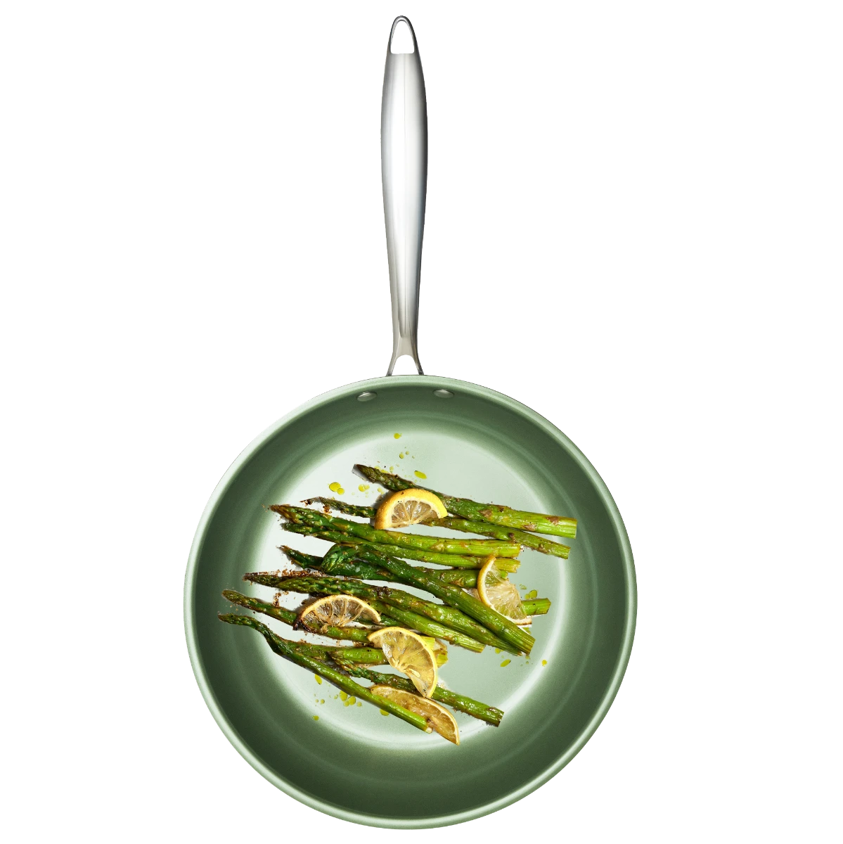 De Ceravegan pannenserie is 100% vegan en staat voor groene innovatie dankzij de keramische antiaanbaklaag op plantaardige basis. Er is speciaal gekozen voor een microfilm op basis van avocado-olie, omdat een avocado een echte superfood is! De olie van het gezonde fruit bestaan uit onverzadigde omega-9-vetten die tot de cholesterolverlagende vetten horen. Daarom is deze olie is perfect om te gebruiken tijdens het koken, want het kan tot enorm hoge temperaturen verwarmd worden zonder te verbranden. Met deze pannen met de unieke en plantaardige coating kook je kook je veganistisch, vetvrij en duurzaam.