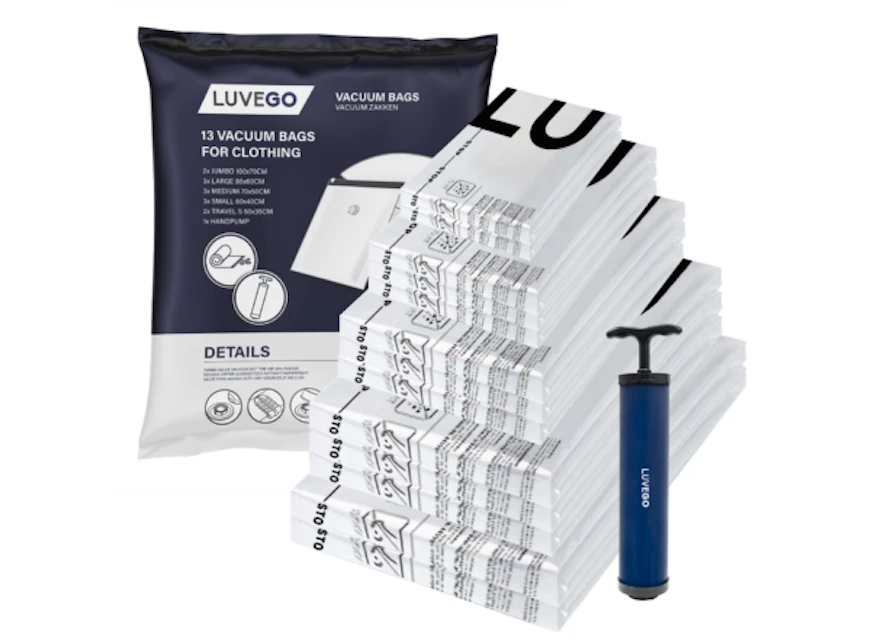 De vacuümzakken zijn vervaardigd van stevig plastic waardoor de opbergzakken helemaal vacuüm blijven. Verder zijn de de zakken vochtbestendig en dankzij het stevige plastic zijn scheurtjes in de zakken verleden tijd. De 13-delige vacuüm opbergzakken set wordt geleverd met een klein handpompje om zelf de vacuümzakken vacuüm te zuigen. Desalniettemin raden we aan een stofzuiger te gebruiken voor de grotere opbergzakken aangezien dit een stuk sneller gaat.
