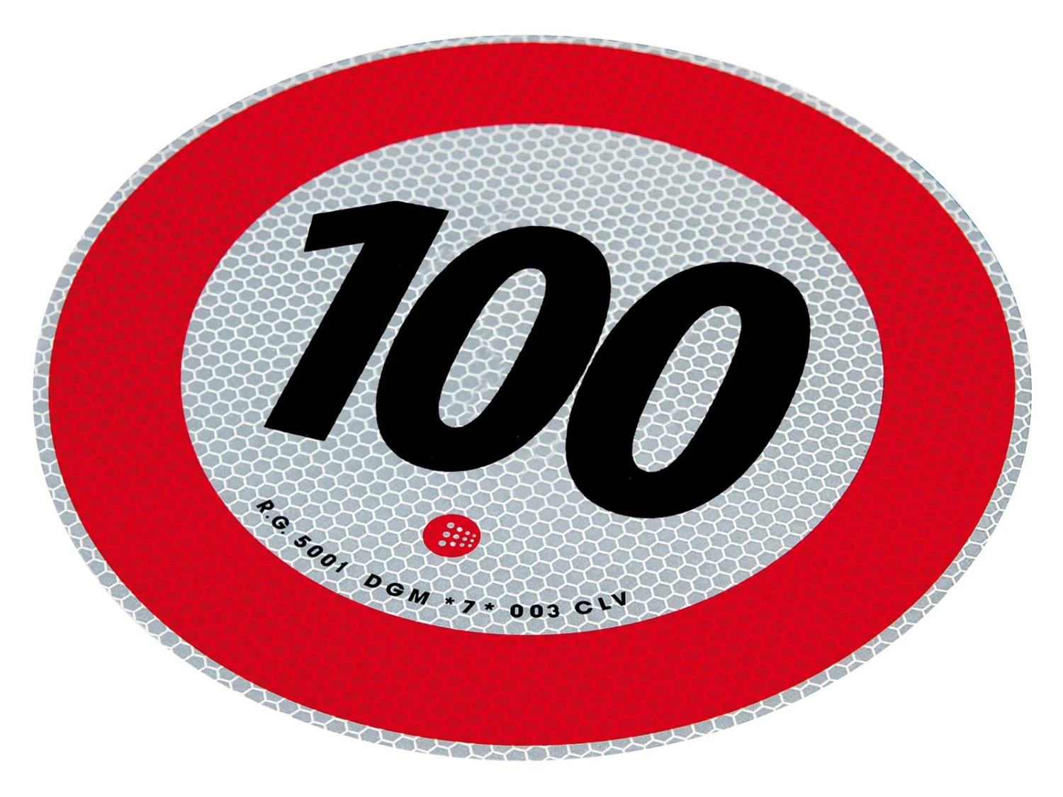 Zelfklevende sticker welke gebruikt kan worden als markering om een maximumsnelheid van 100 km/h aan te geven.