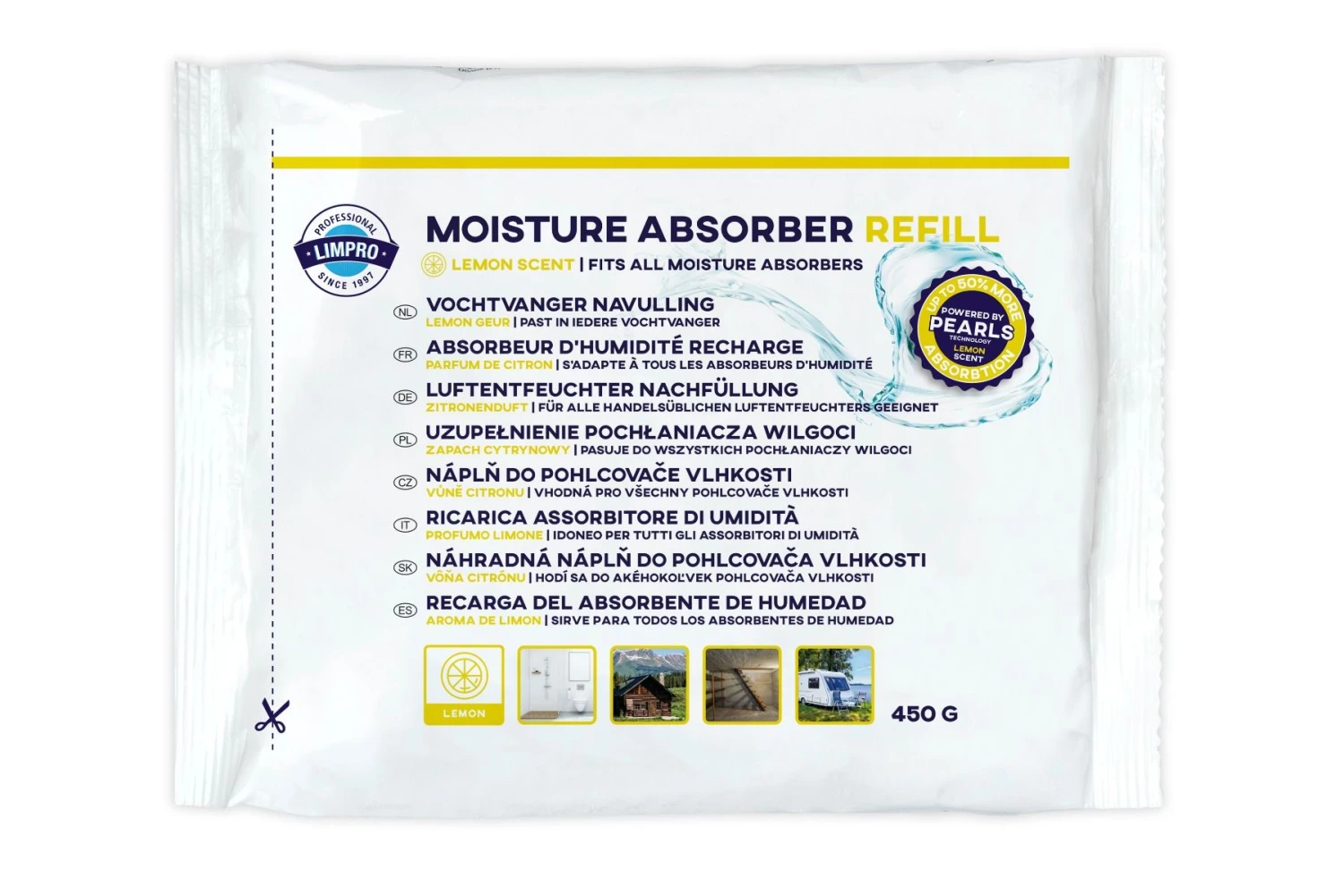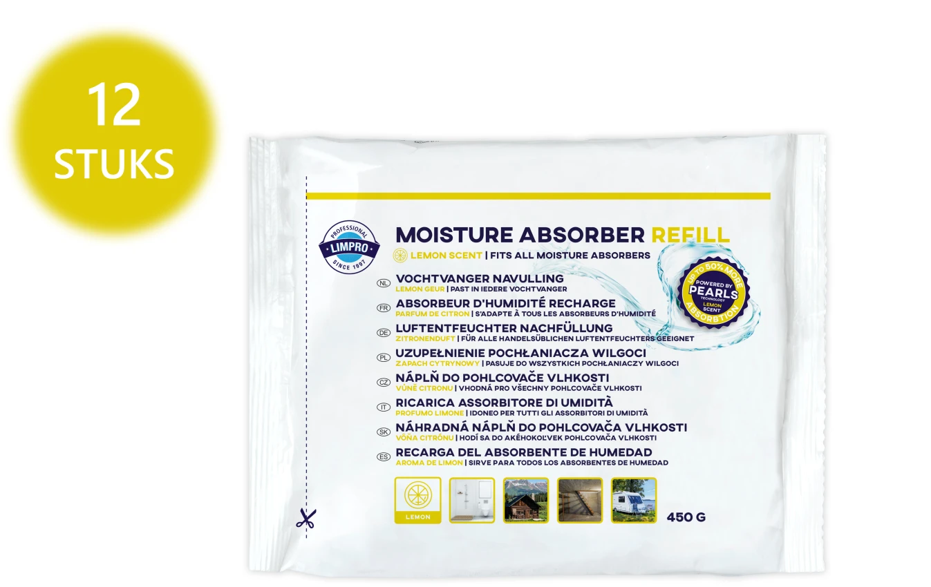 Limpro vochtvangers absorberen overtollig vocht in de ruimte met de extra krachtige vochtopnemende parels. Deze speciale Pearls zijn extra krachtig en absorberen tot 50% meer vocht dan de normale vochtvangers. Ze verspreiden tevens een subtiele lemongeur. Bevat 12 navullingen van 450 gram en is geschikt voor alle soorten vochtvangers.