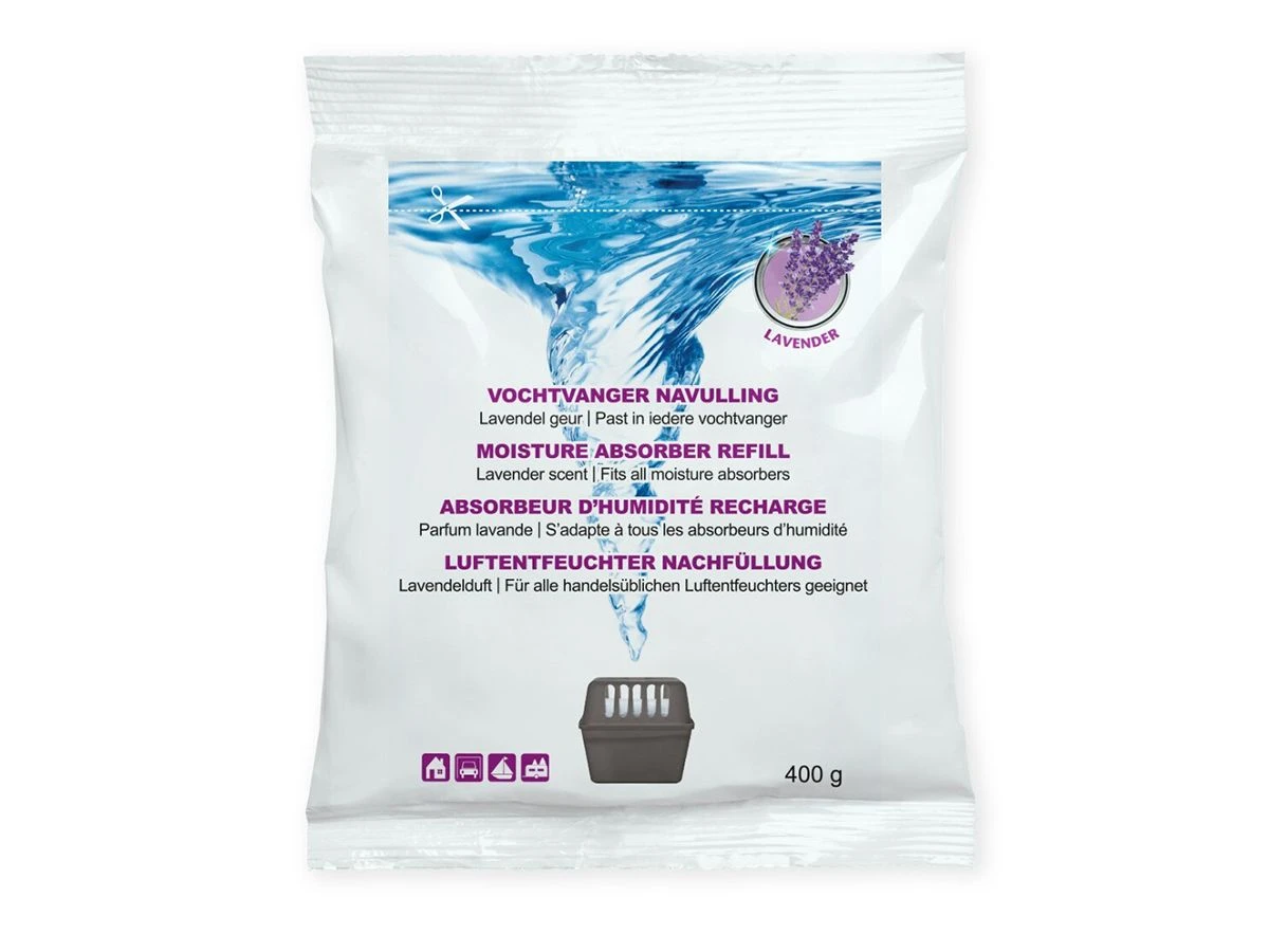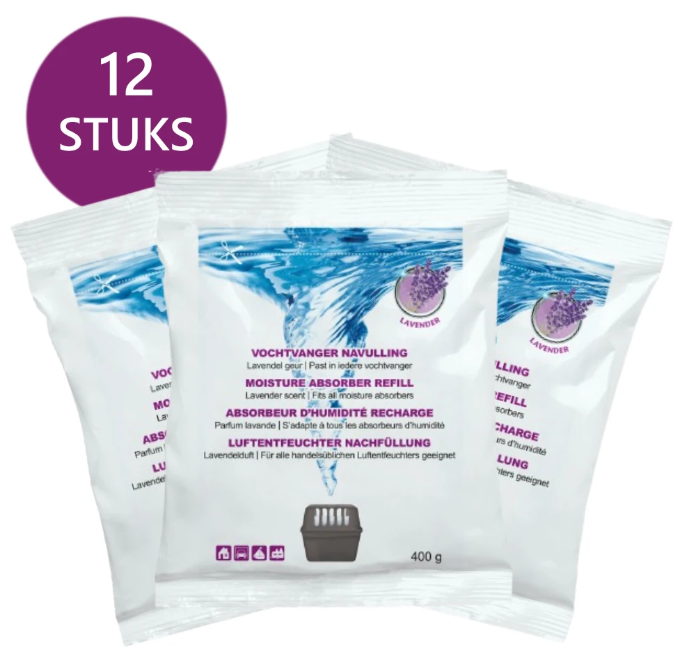 Vochtvanger navullingen met lavendel geur van 400 gram voor iedere vochtvreter. Absorberen overtollig vocht in de ruimte en één navulling gaat ongeveer 1-3 maanden mee. Lokaal geproduceerd per 12 verpakt en daarom zeer scherp geprijsd.