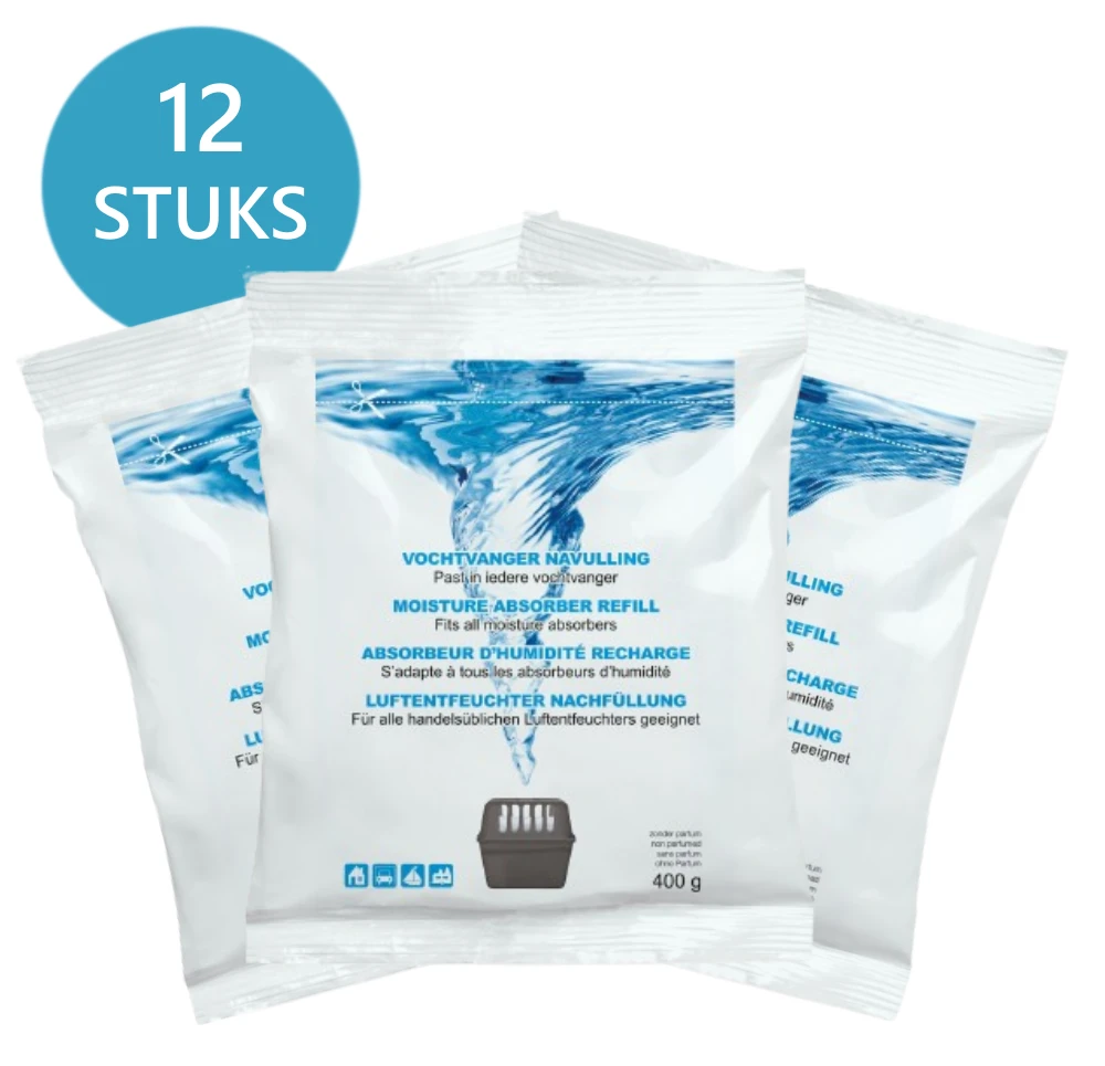 Geurloze vochtvanger navullingen van 400 gram voor iedere vochtvreter. Absorberen overtollig vocht in de ruimte en één navulling gaat ongeveer 1-3 maanden mee. Lokaal geproduceerd per 12 verpakt en daarom zeer scherp geprijsd.
