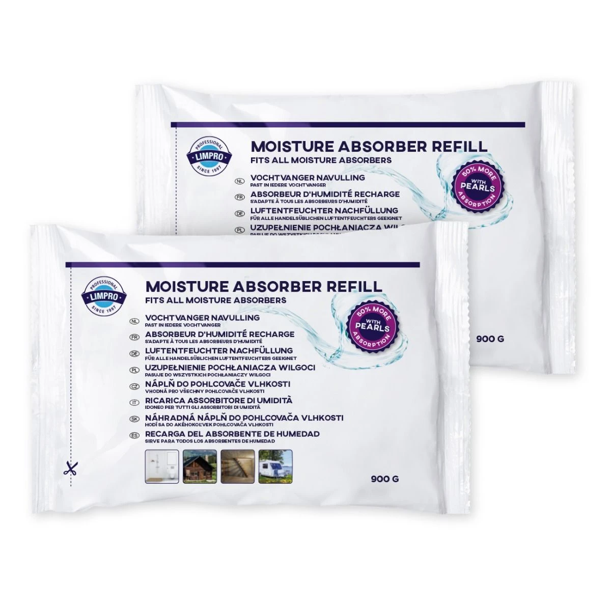 Limpro Vochtvanger bestrijdt overtollig vocht in de ruimte. De extra absorberende korrels nemen tot 50% meer vocht op dan de reguliere korrels. De opvangbak is stevig en compact van design en de grote sleuven zorgen voor optimale luchttoevoer. Bevat 2 vochtvangers.