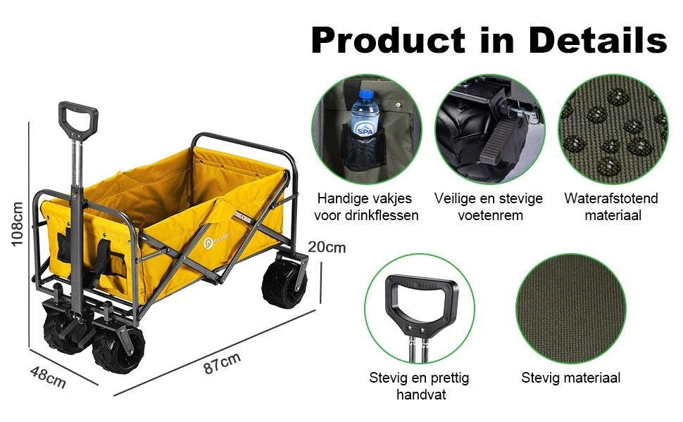 Deze wagen is perfect voor buitenreizen, strandvakanties, kamperen, tuinieren en winkelen. Wij bieden 2 JAAR GARANTIE op alle onderdelen op de bolderkar. We bieden ook een 100% risicovrije tevredenheidsgarantie, als je er niet tevreden mee bent, zullen we graag terugbetalen.