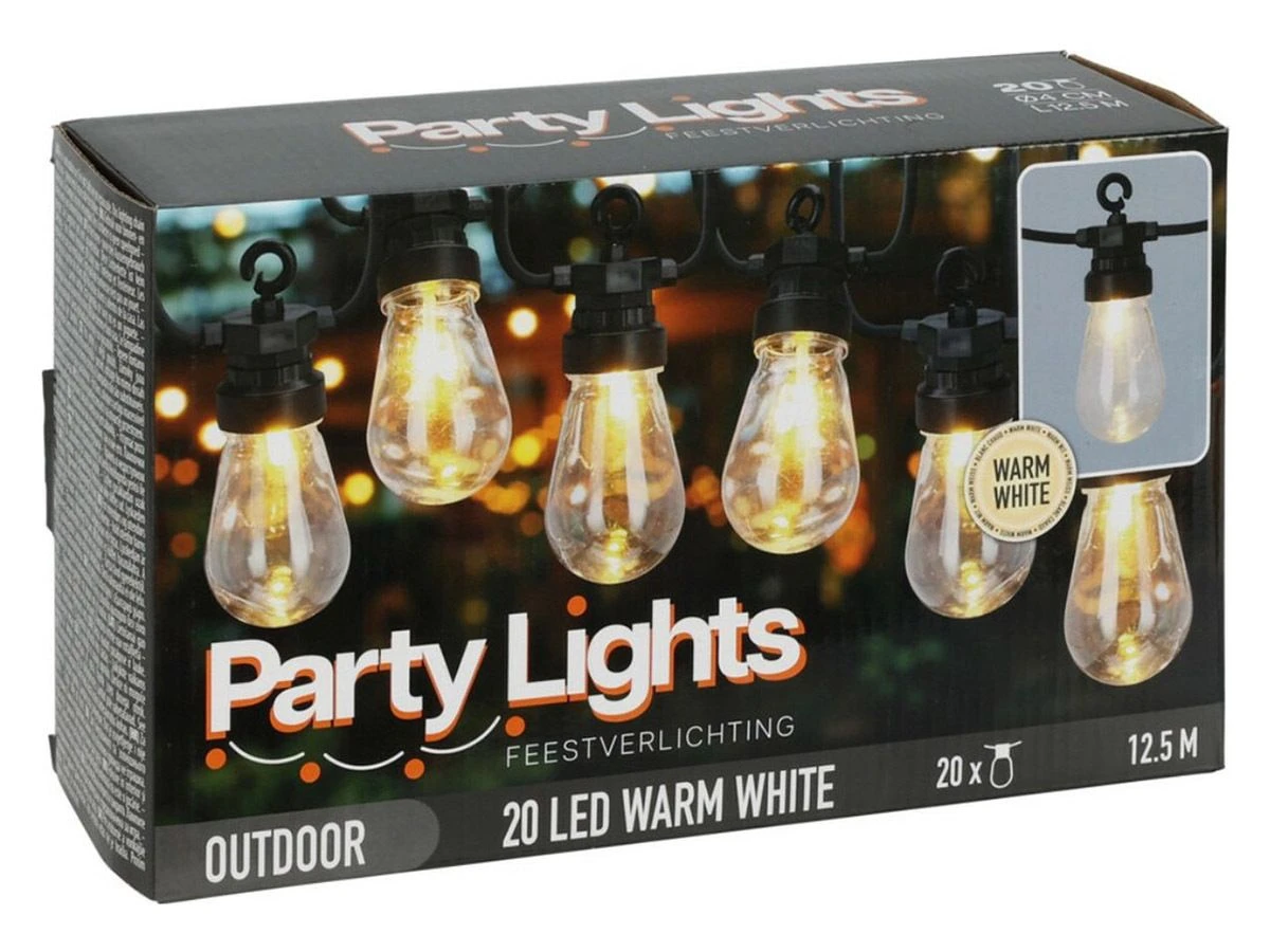 Deze party verlichting ziet eruit als een prikkabel. De feestverlichting werkt op het netstroom en heeft 20 LED lampjes. Super leuk tijdens een feestje in de tuin!