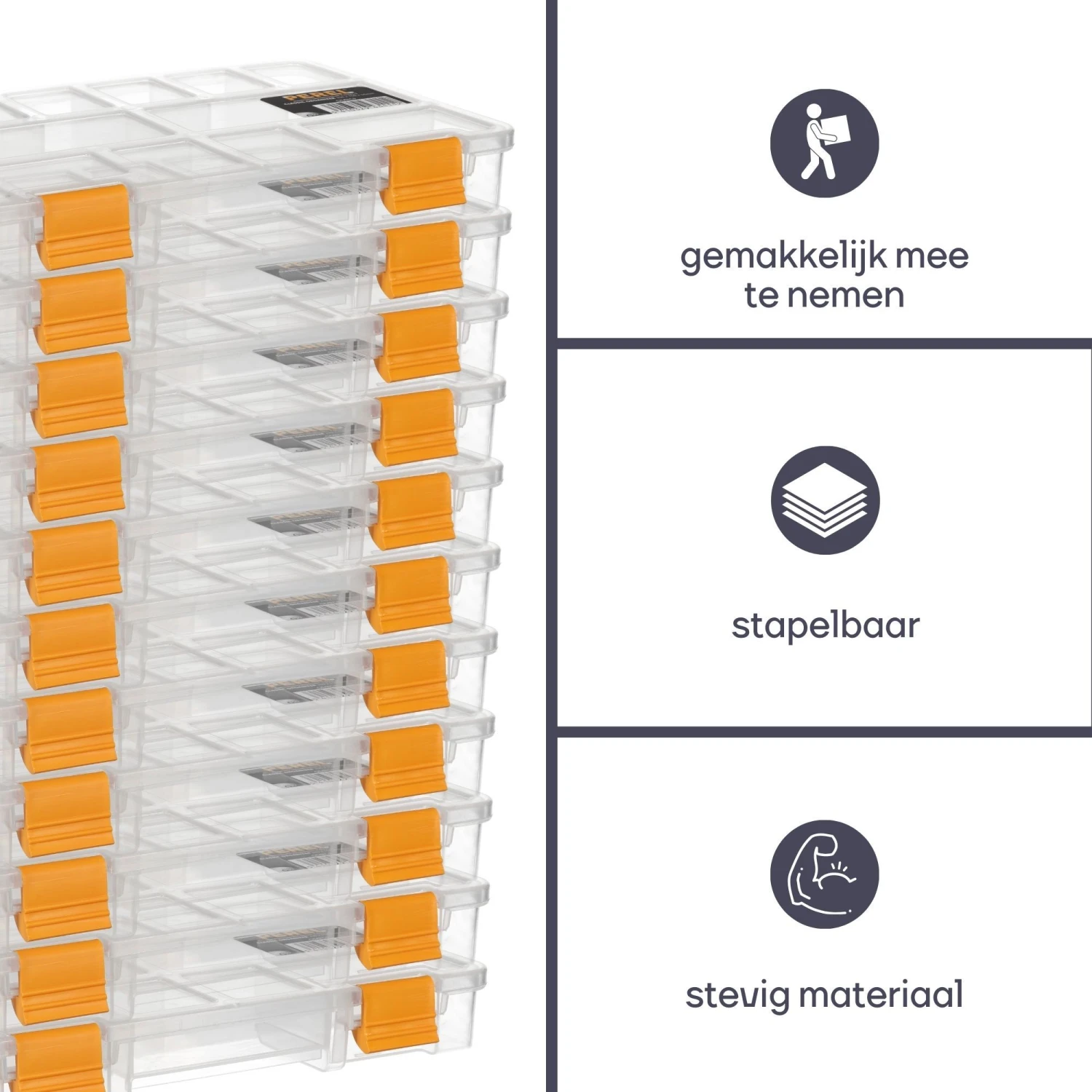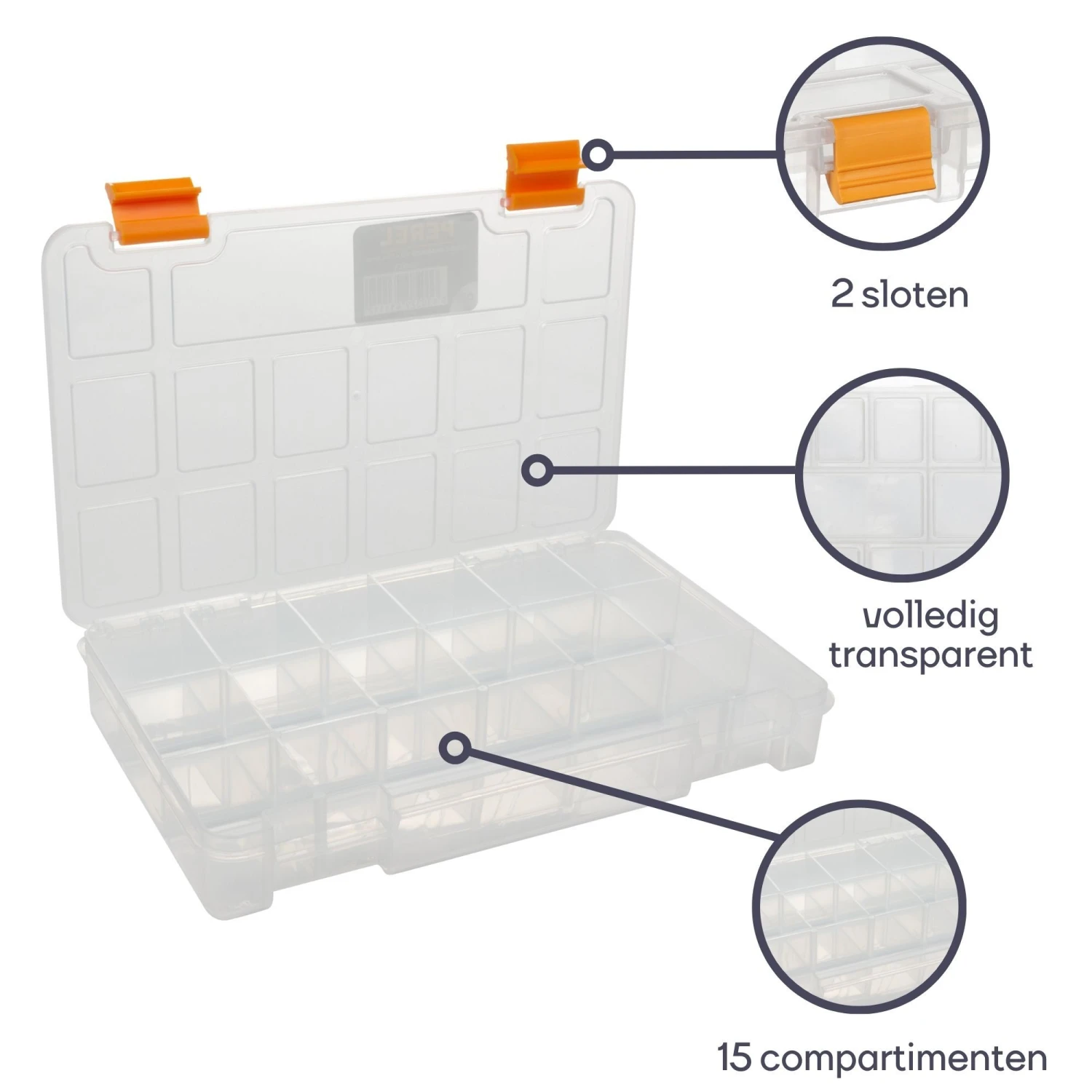 Met deze assortimentsdoos heb je al je materiaal altijd binnen handbereik. De opbergvakken zijn ideaal om allerlei soorten kleine onderdelen en accessoires zoals nagels, moeren, schroeven, knutselgerief, vishaken enz. in op te bergen. De volledige sorteerkoffer is doorzichtig zodat de inhoud altijd goed zichtbaar is.