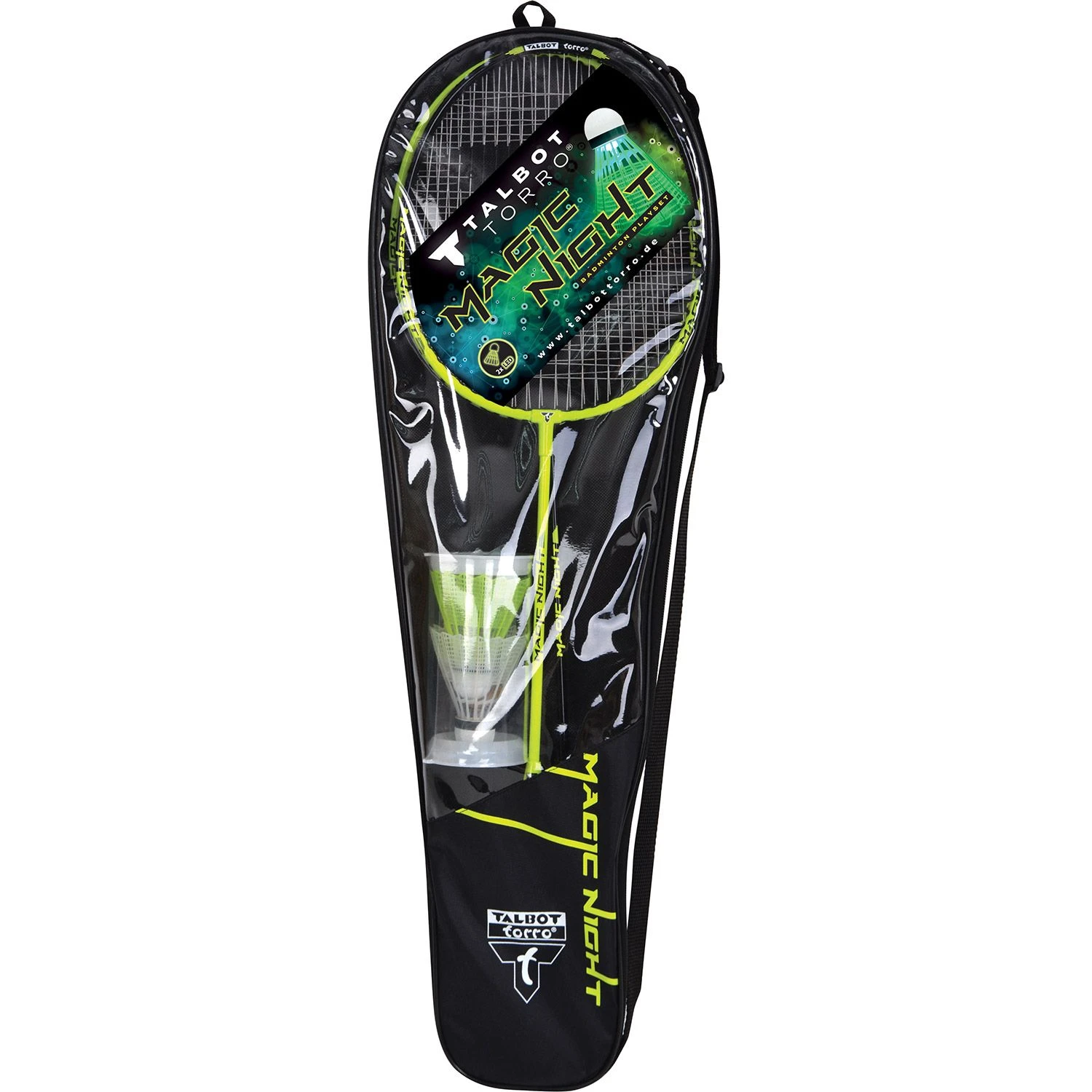 Een set van 2 badmintonrackets van goede kwaliteit met 2 synthetische LED shuttles. Eén witte shuttle met groen licht en één gele shuttle met rood licht. De shuttles hebben een aan/uit schakelaar en kunnen ongeveer 48 uur branden. Het set wordt geleverd in een handige draagtas.