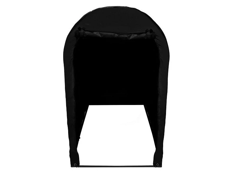 Onze bromfietsgarage heeft een zwart gepoedercoat stalen frame dat ongelooflijk sterk en duurzaam is. Het frame is opgebouwd uit 3 hoofdbalken, waardoor het zijn vorm behoudt en dankzij de gebogen structuur regen en sneeuw kan afvoeren. Voor een eenvoudige toegang kan de grote ritsdeur worden opgerold en worden opengehouden met behulp van het klittenband.