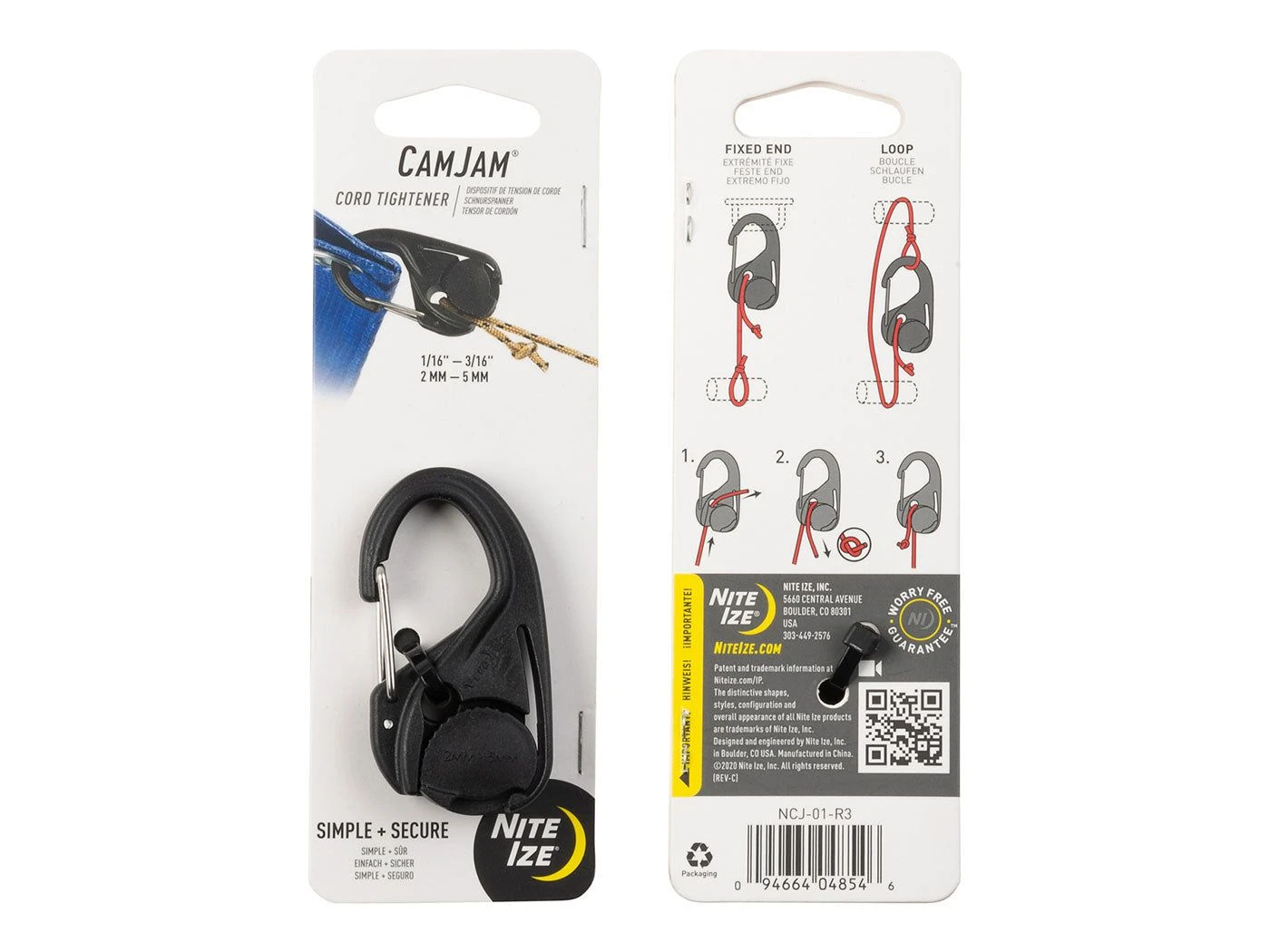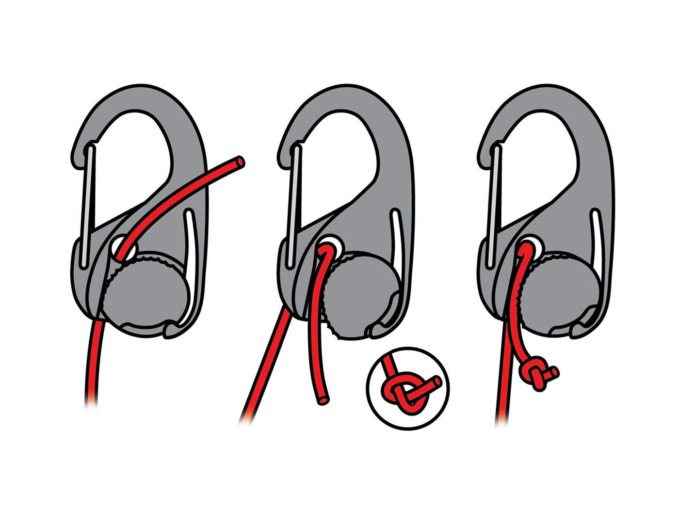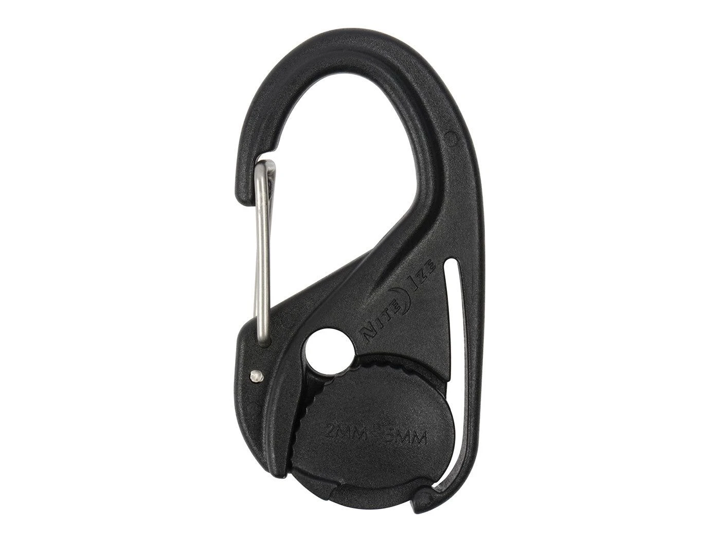 Zwarte Carabiner met ingebouwd spansysteem om nylon koord mee vast te zetten.