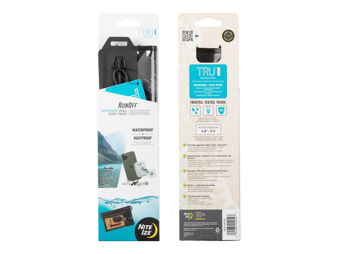 De RunOff Waterproof Travel Pouch is zoals de naam al aangeeft een waterdicht opberg etui, geschikt voor bijvoorbeeld autosleutels, mobiele telefoon, portemonnee en ga zo maar door. De touchscreen van je telefoon werkt zelfs door de transparante voorkant. De RunOff is voorzien van de zogenaamde TRU-zip, dit is ’s werelds eerste water- en stofdichte rits. Het compartiment waarin je spullen kunt stoppen is 12cm hoog 22.50cm in lengte. De RunOff is gemaakt van TPU, een flexibel en ultra duurzaam synthetisch rubber. Het breekt niet en trekt geen stof aan en krast nauwelijks.