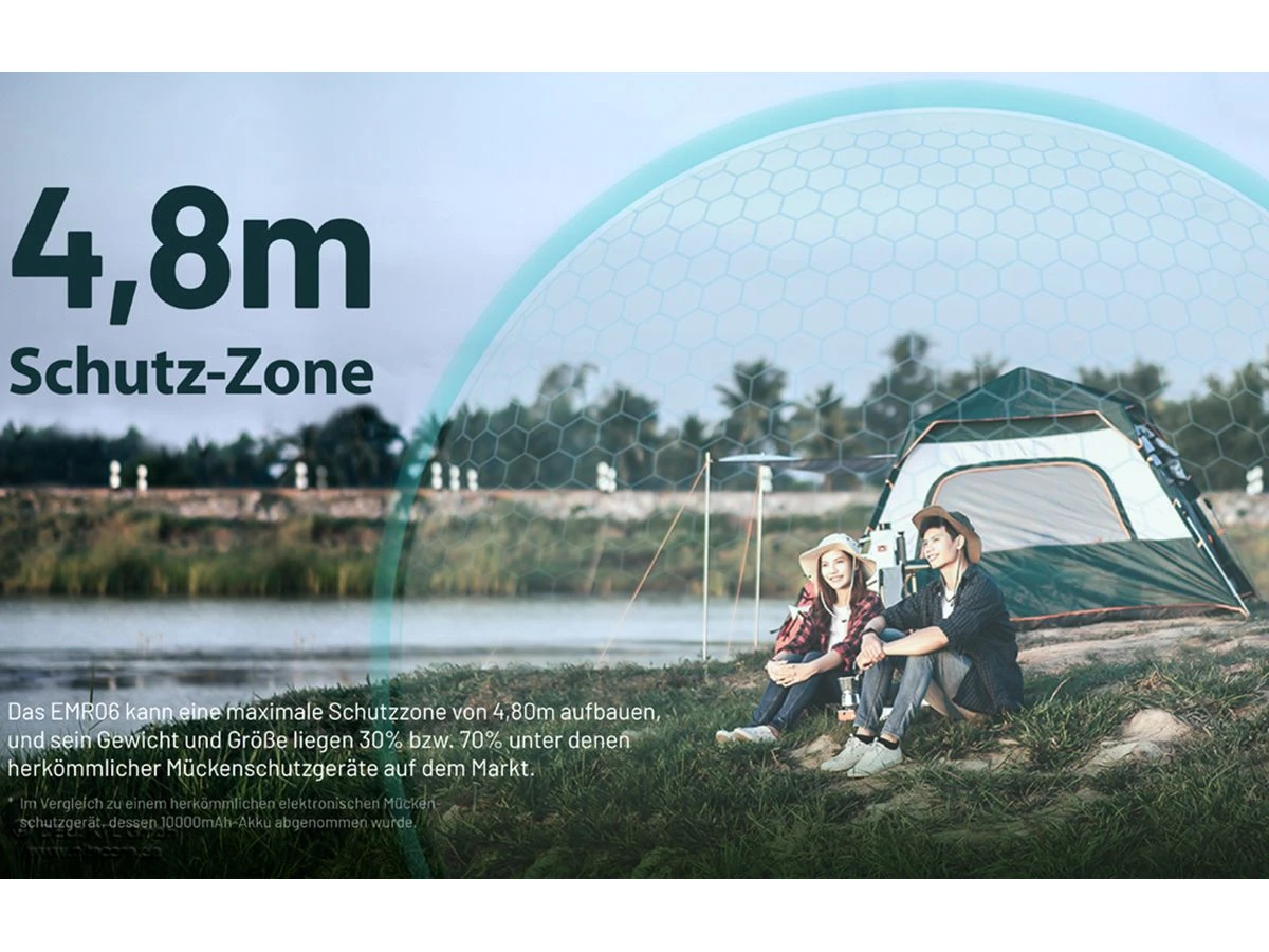 Vergeleken met conventionele muggenverjagers die op brandstof werken is de EMR06 efficiënter en veiliger. Hij werkt met een muggenwerende mat die tot 6 uur werkt en heeft een beschermingszone van maximaal 4,8 meter. Hij kan muggen in 10 minuten verjagen dankzij de combinatie van warmteactivering en de muggenverjagende mat. De EMR06 wordt gevoed door een geïntegreerde Li-ion batterij (1800 mAh) die via de USB-C poort die aan de onderzijde zit opgeladen wordt. Hiervoor wordt een USB-C laadkabel meegeleverd. Een LED indicator geeft de status van de batterij aan.