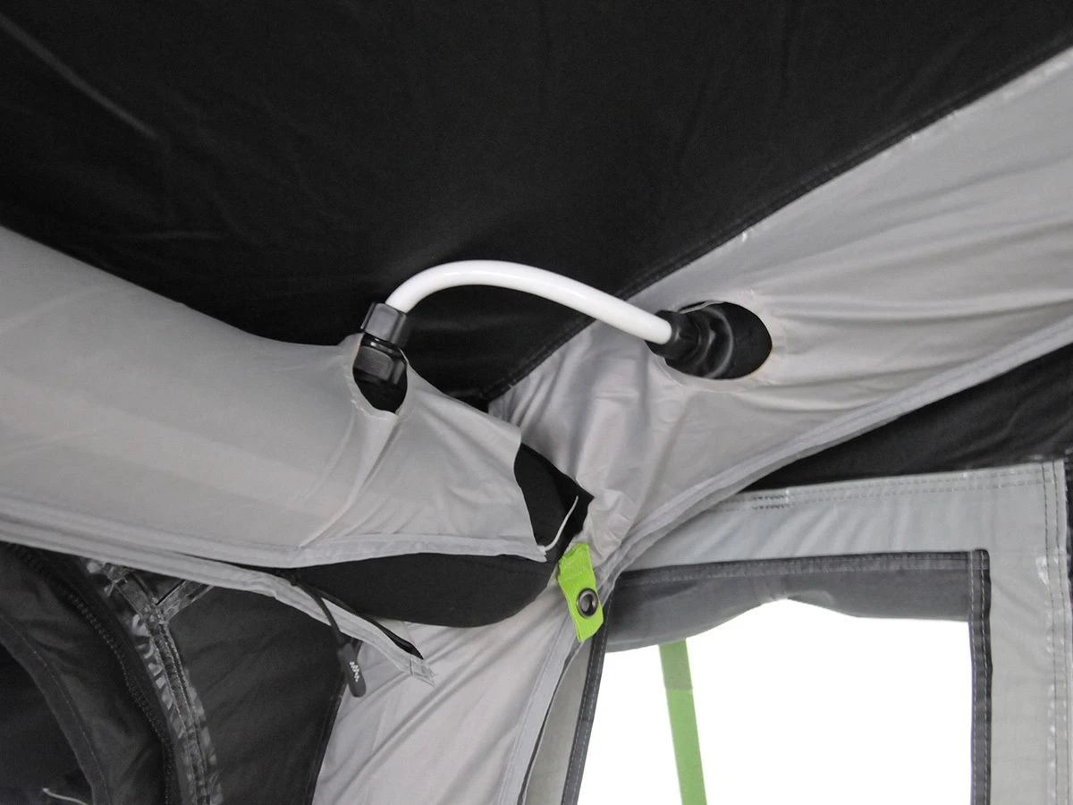 Aan de achterkant is de Castello 390 voorzien van schuimkussens die met de meegeleverde aandrukstangen stevig tegen de zijwand van de camper of caravan gedrukt kunnen worden. Dit zorgt voor een stevige aansluiting en voorkomt tocht. Verder is de voortent links en rechts voorzien van bevestigingsogen waar een garderobestang (niet inbegrepen) aan bevestigd kan worden. In totaal kun je twee garderobestangen plaatsen.