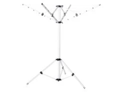 Deze droogmolen is een 4-arms model inclusief voet. Je kunt hem dus over plaatsen waar je maar wilt. En dankzij de 3 meegeleverde haringen zet je de droogmolen eenvoudig vast aan de grond zodat een beetje wind geen probleem is!