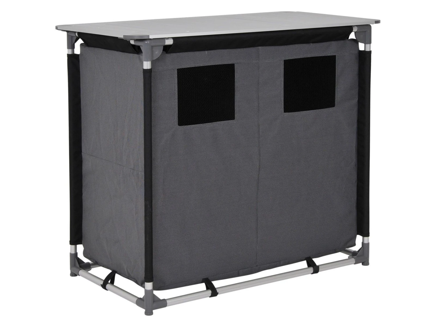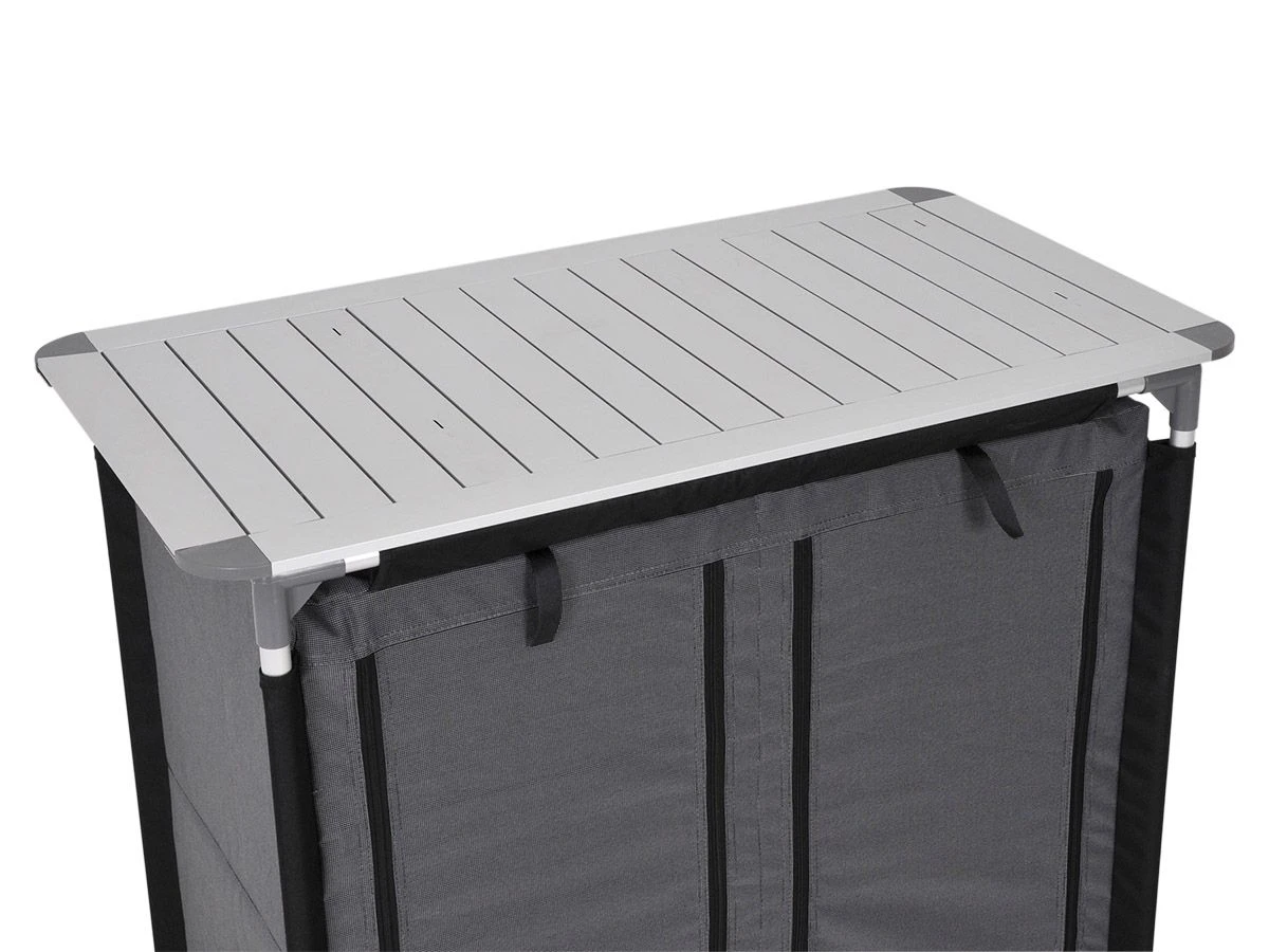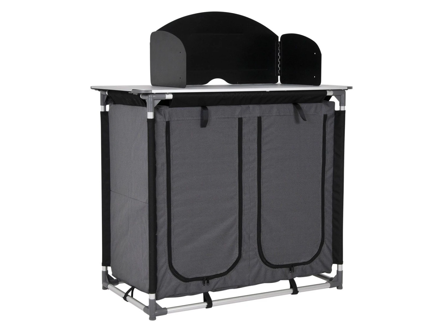 De Florence is voorzien van een windscherm die ervoor zorgt dat je kooktoestel niet uitwaait door te veel wind. Het windscherm is te gebruiken bij een kooktoestel met een maximale afmeting van 60 x 40 cm. Het windscherm kan ook verwijderd worden van het bovenblad zodat je de campingkeuken ook als gewone campingkast kunt gebruiken. Deze campingkeuken kan opgeborgen worden in de meegeleverde draagtas.
