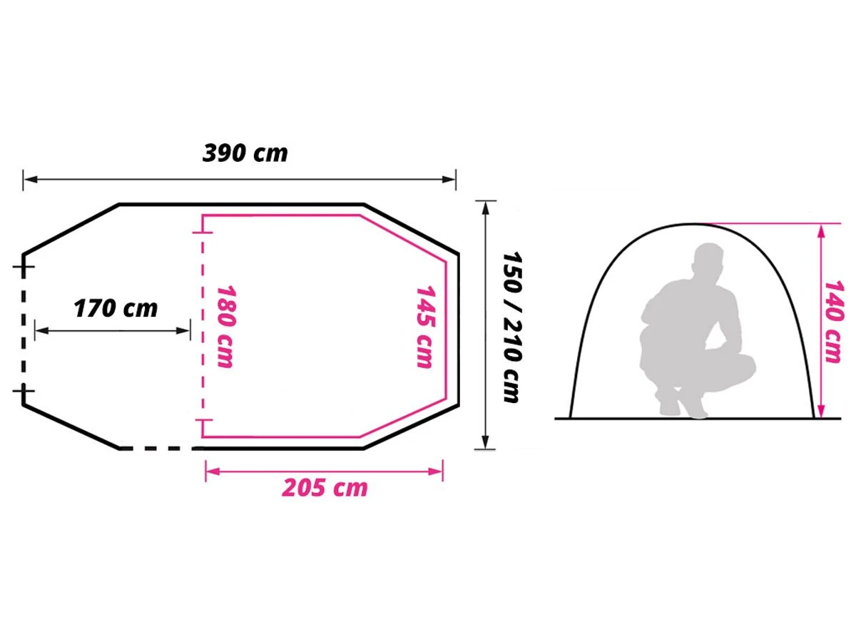 De slaapcabine heeft een afmeting van 180 x 205 centimeter, dat is ruim genoeg om met zijn drieën op een slaapmat te kunnen liggen. Wil je liever op een luchtbed liggen? Daarvan passen er maximaal twee in.