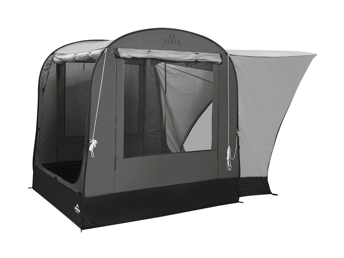 Aan de achterzijde is de Ontario voorzien van een aansluitflap met een diepte van maar liefst 150 cm. Deze kan eenvoudig met scheerlijnen over het dak van de auto of bus heen gespannen worden. De Deur in de achterwand is breed genoeg om met de achterklep doorheen te kunnen. Beide zijwanden zijn voorzien van grote gaaspanelen die van buitenaf af te dekken zijn met een afdekflap. Dankzij het vaste kuipgrondzeil blijven regenwater en ongedierte buiten de tent.