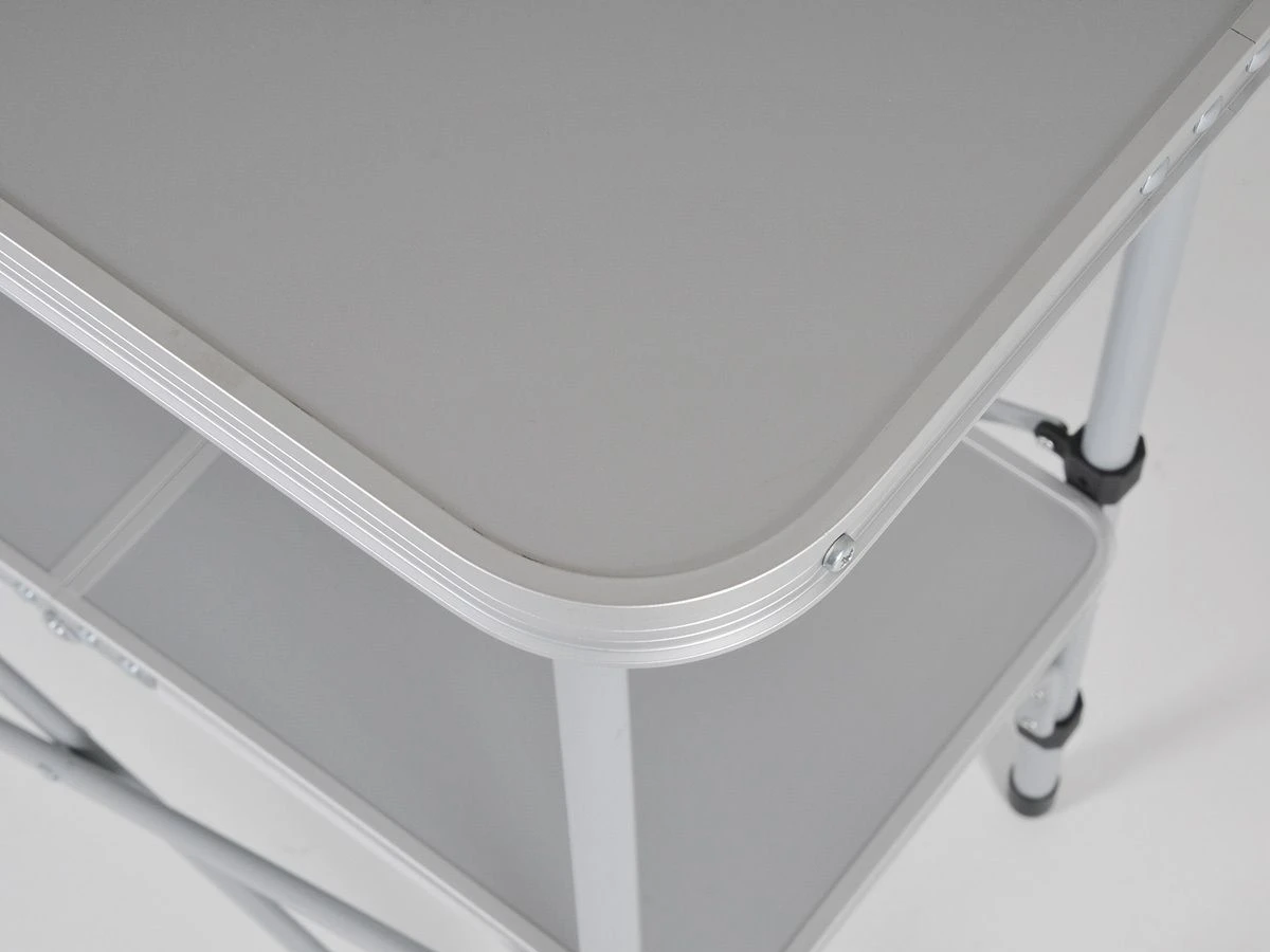 Deze kooktafel is voorzien van een aluminium werkblad, dit betekent dat het blad hittebestendig en watervast is. Ideaal om op te koken. Onder het tafelblad zit een extra blad waarop je je keukenspullen kwijt kunt.