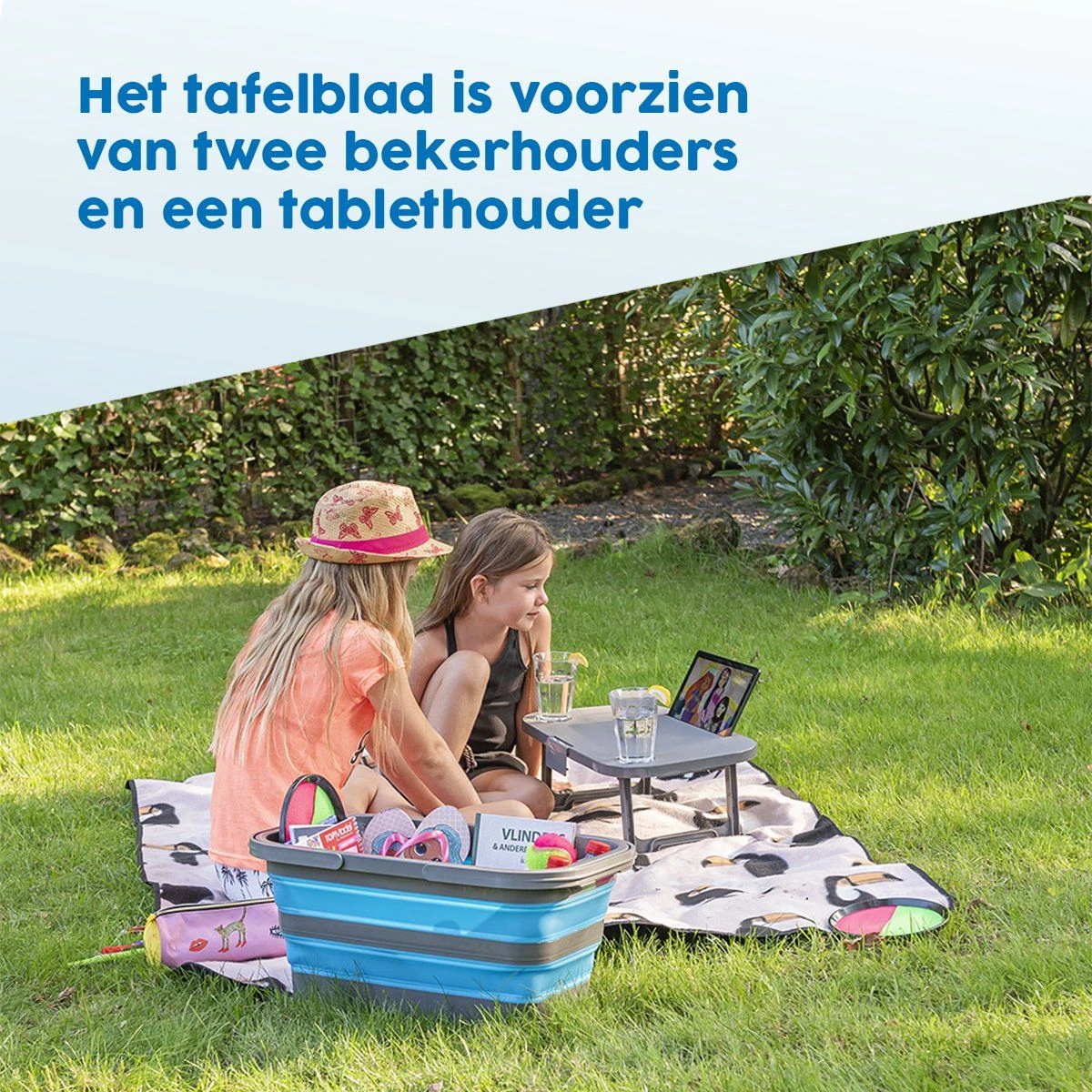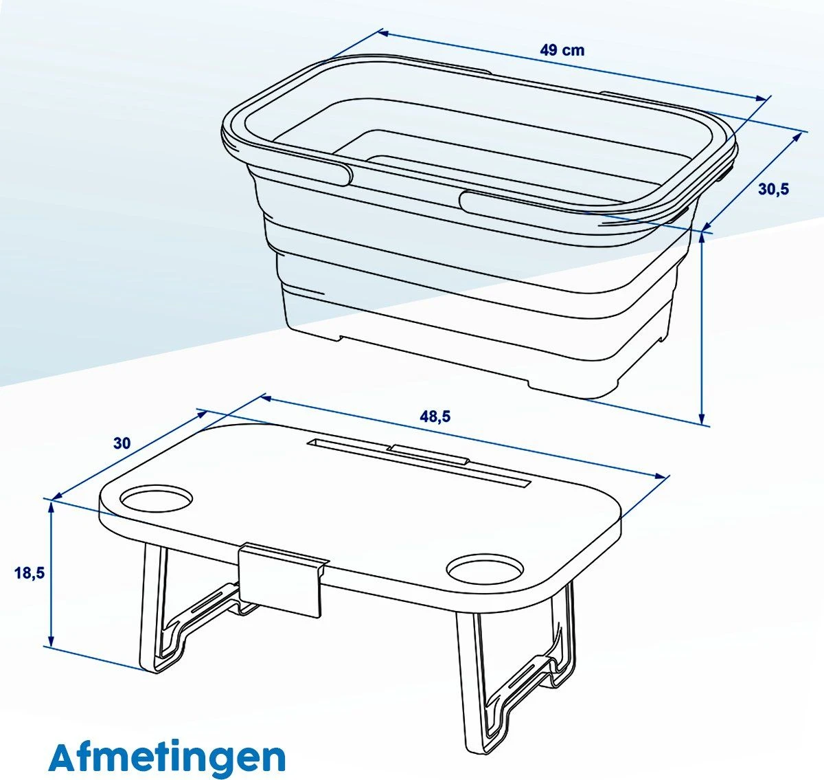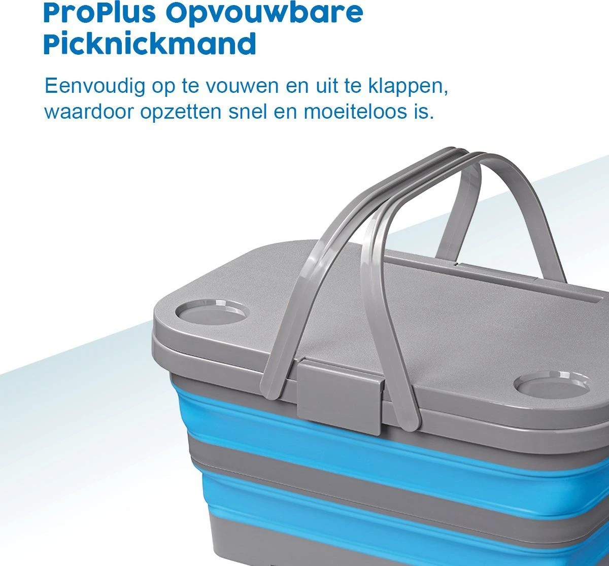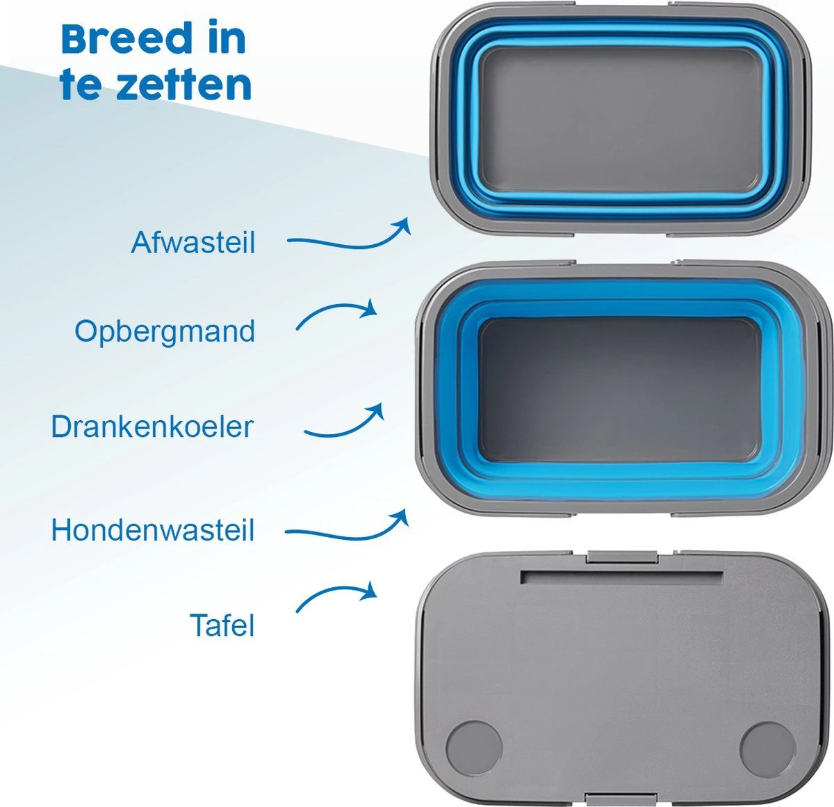 Deze multifunctionele, ruime opvouwbare mand met deksel is zeer geschikt als picknickmand, maar ook ideaal als (af)wasteil, opbergmand, drankenkoeler of hondenwasteil. De deksel is voorzien van uitklapbare pootjes en daarmee om te toveren tot een handig picknicktafeltje. Heel praktisch zijn daarbij de uitsparingen in het tafelblad voor 2 bekers en een tablet. Specificaties: – Materiaal: PP + TPR – Afmetingen: 51,6 X 31,3 X 25 X 8,6 cm – Inhoud: 20L – Kleur: blauw/grijs – Eenvoudig schoon te maken – Compact op te bergen