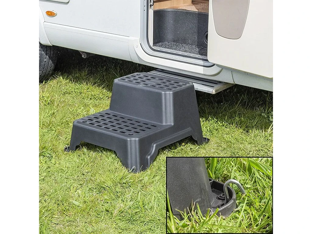 Om de ProPlus dubbele kunststoffen opstap nog steviger te laten staan is hij voorzien van gaten waardoor je de opstap kan borgen. Dit kan door middel van haringen.