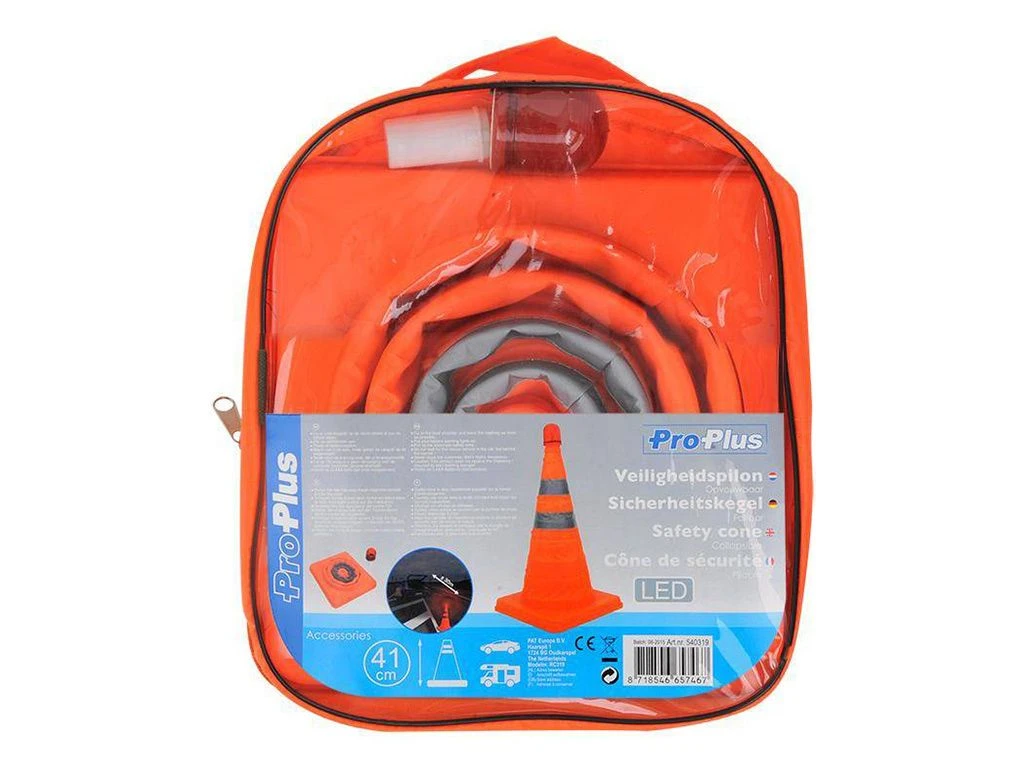 Deze veiligheidspylon met knipperende LED verlichting is opvouwbaar en heeft twee reflecterende strepen. De pylon wordt geleverd in een handige draagtas voor gemakkelijke opslag en transport en werkt op 2x AAA batterijen.