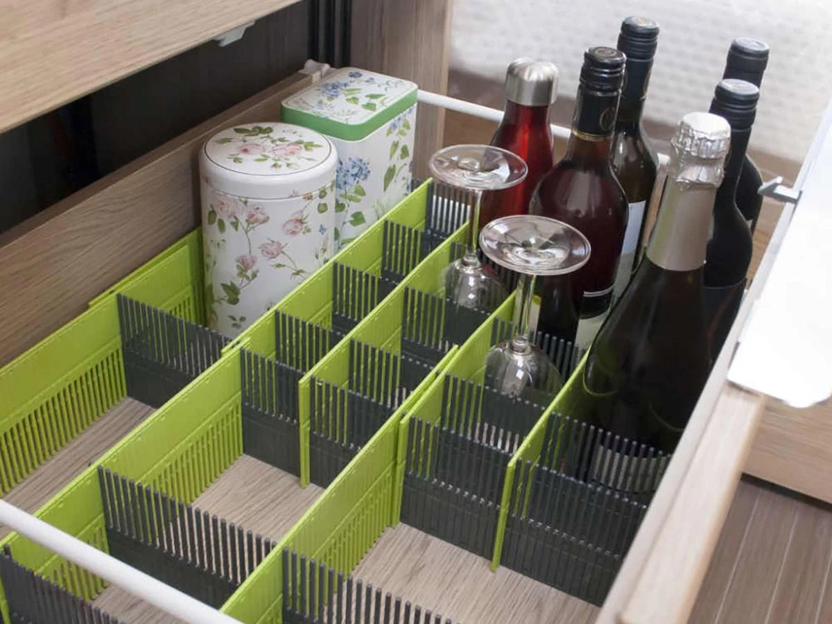 Met de Purvario lade organizer is het nu mogelijk om spullen zoals hoge glazen, flessen, huishoudelijke artikelen veilig, ruimtebesparend en stil te vervoeren. De verdelers hebben een afmeting van 33 x 0,30 x 10 cm.
