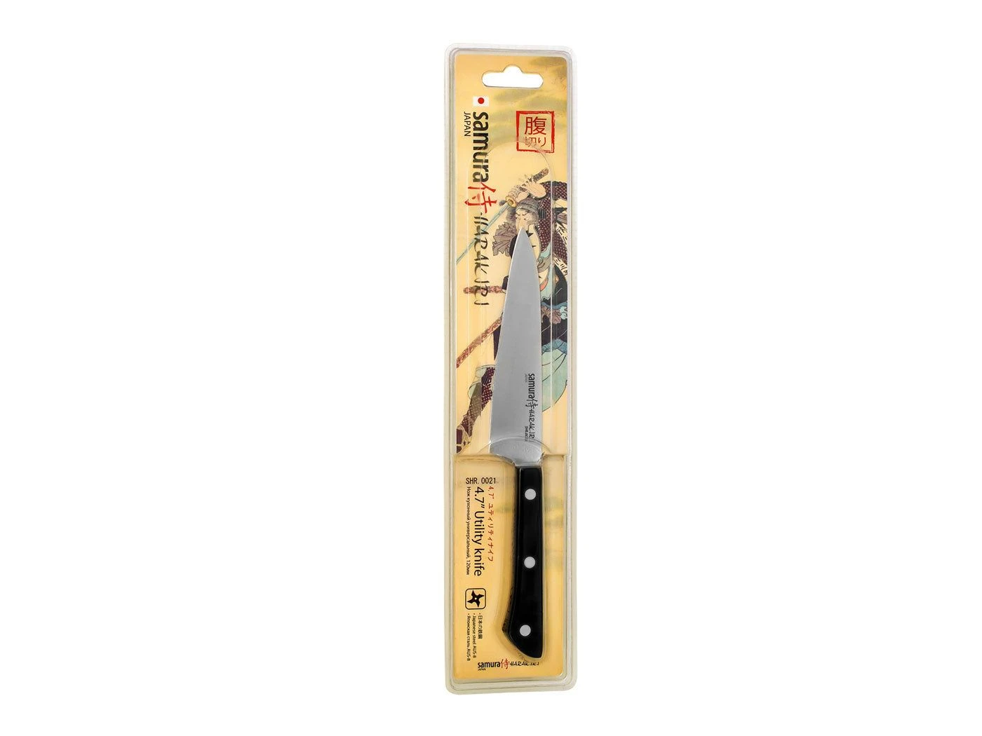 Het Samura Harakiri Utility Knife is een gemiddeld formaat keukenmes met een Japanse uitstraling. Het lemmet is van hoogwaardig AUS-8 roestvrij staal. Deze van origine Japanse staalsoort staat bekend om zijn taaiheid en scherptebehoud. Het lemmet loopt helemaal door in de handgreep, dit zorgt voor meer stevigheid. Het heft is van ABS, dit is een lichtgewicht maar duurzaam materiaal. De balans van het mes ligt aan de achterkant zodat het mes fijn in de hand ligt met snijden. Dit Utility Knife is perfect voor het snijden van groente, fruit, vis en vlees. Het mes blijft het langst mooi als deze niet in de afwasmachine gereinigd wordt.