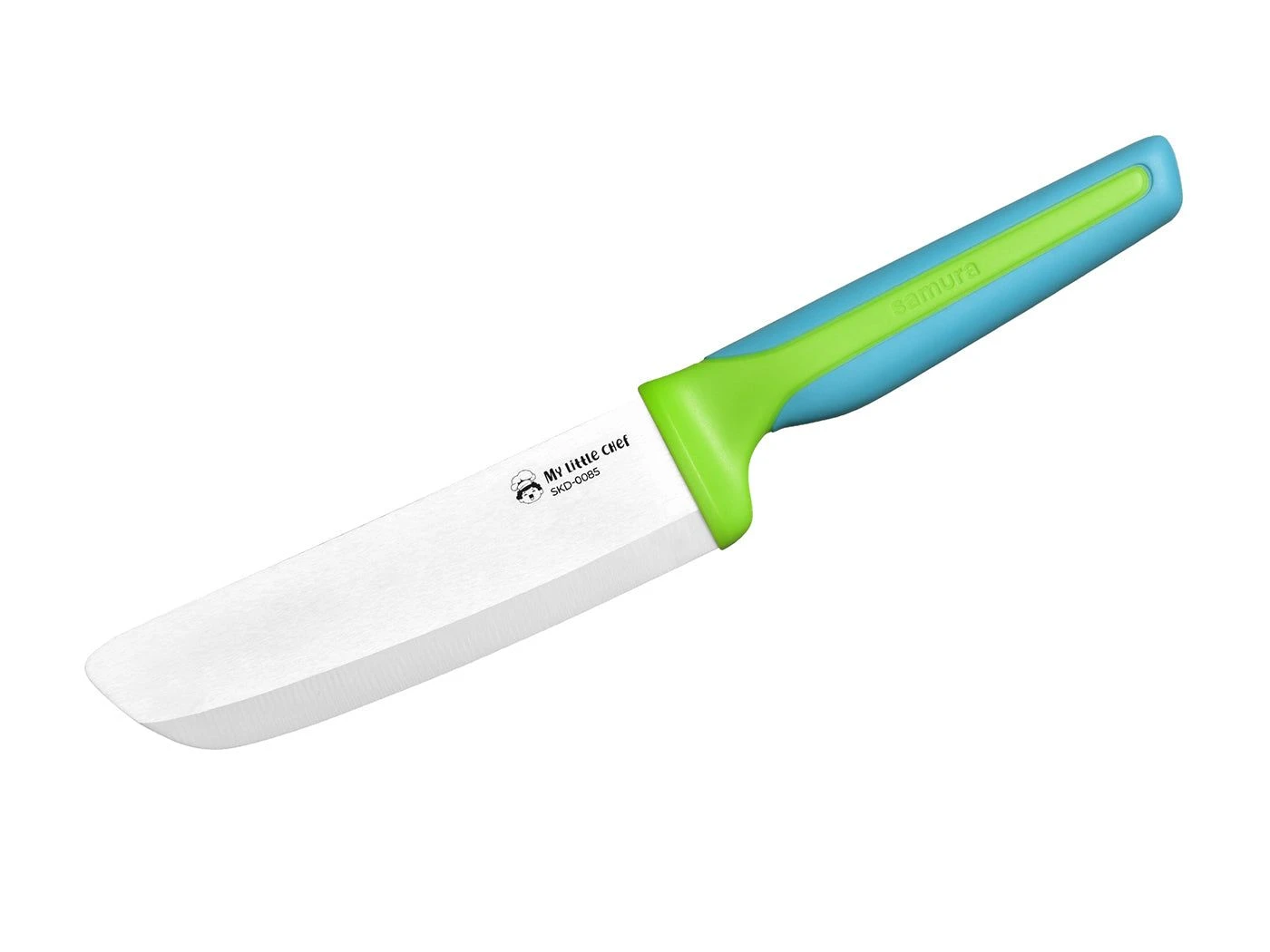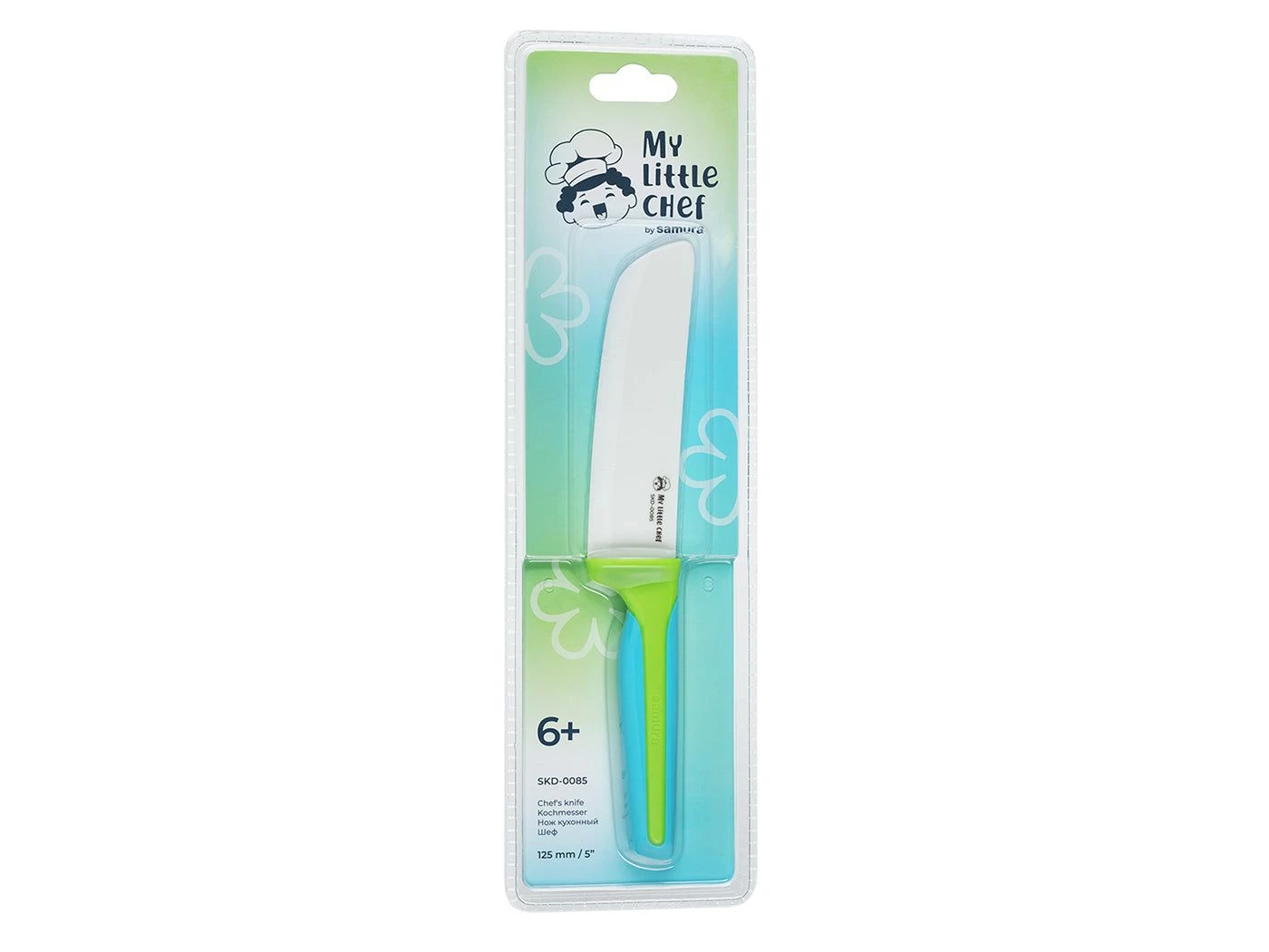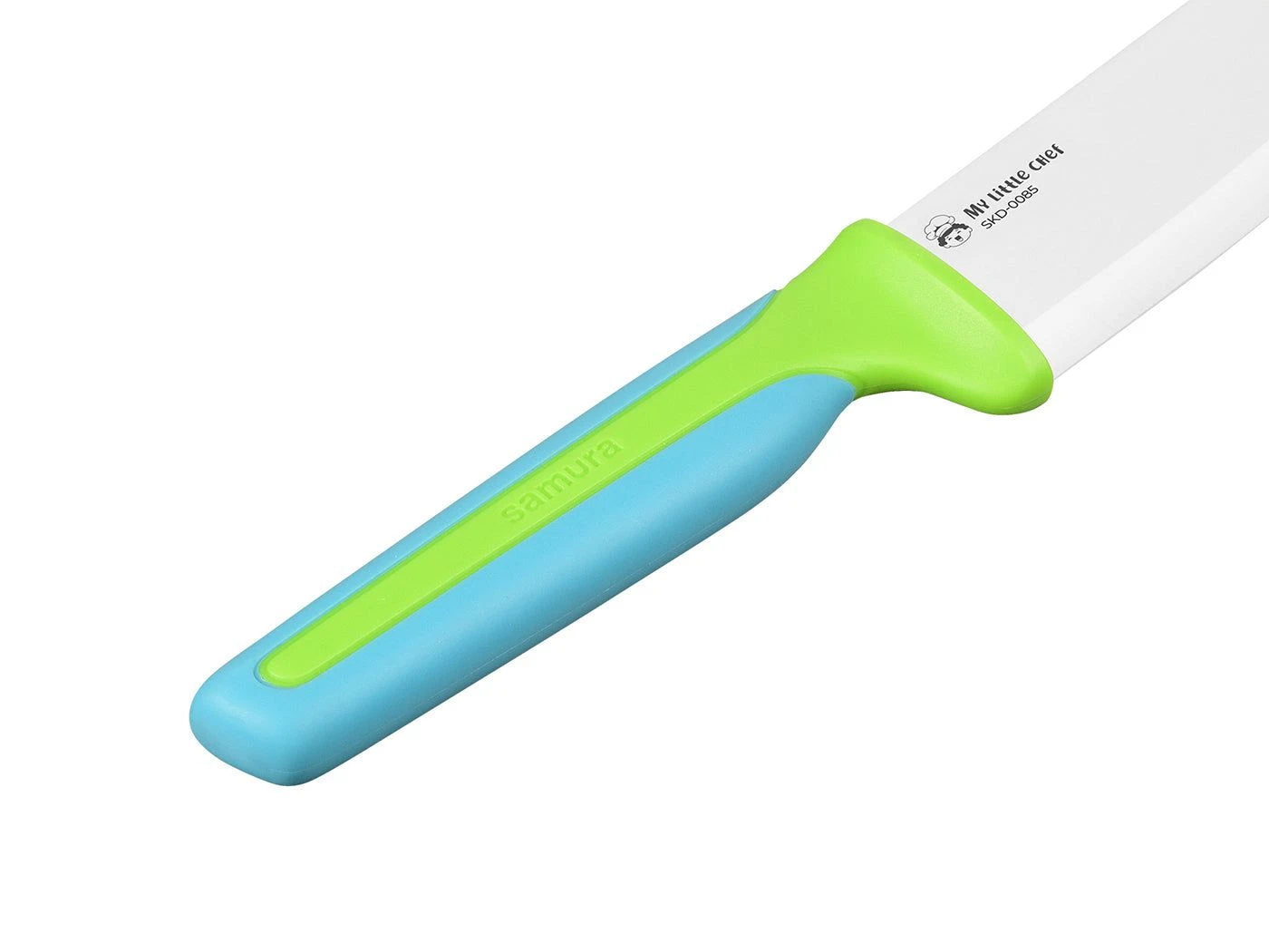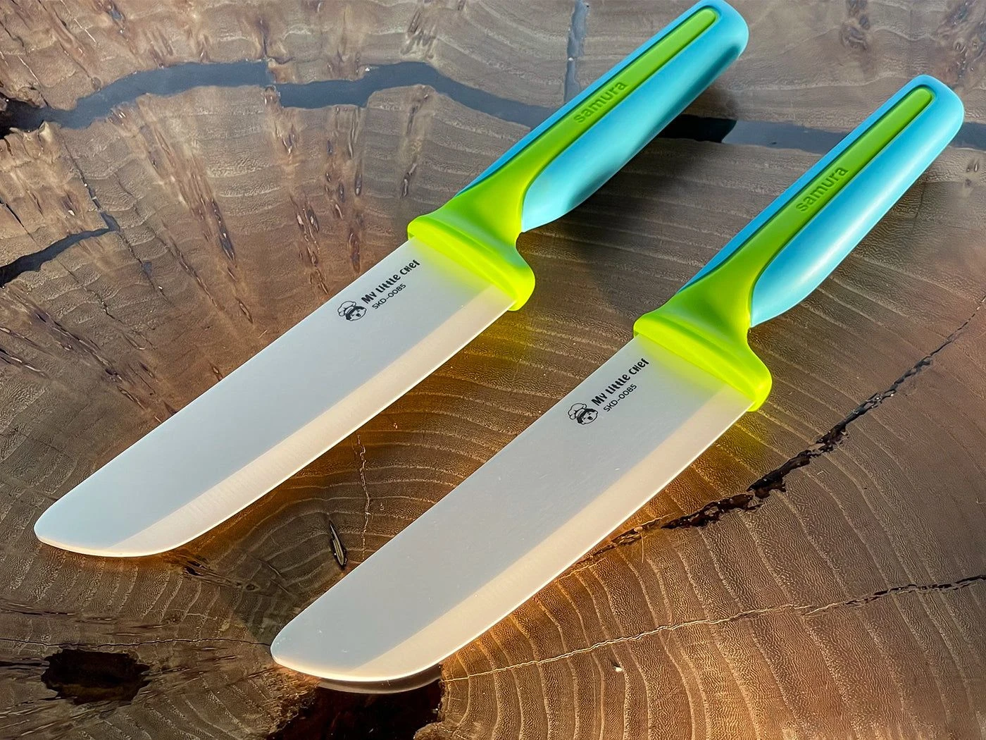 De My Little Chef Knife is keramische kinder keukenmes, waarmee ze onder begeleiding hun ouders kunnen helpen in de keuken. Het lemmet is gemaakt van Zirkonia keramiek, Dit hightech materiaal staat bekend om zijn uitzonderlijke hardheid en langdurige scherpte behoud. Verder geeft een keramiek blad nooit smaak mee aan je gesneden voedsel. Het heft is van ABS, dit is een lichtgewicht maar duurzaam materiaal. Let op gebruik een keramiek mes nooit op een glazen snijplank.