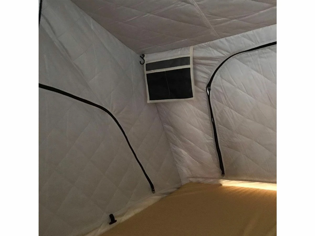De thermo binnentent wordt met klittenband bevestigd aan de binnenzijde van de daktent en kan blijven zitten wanneer de daktent ingeklapt is.