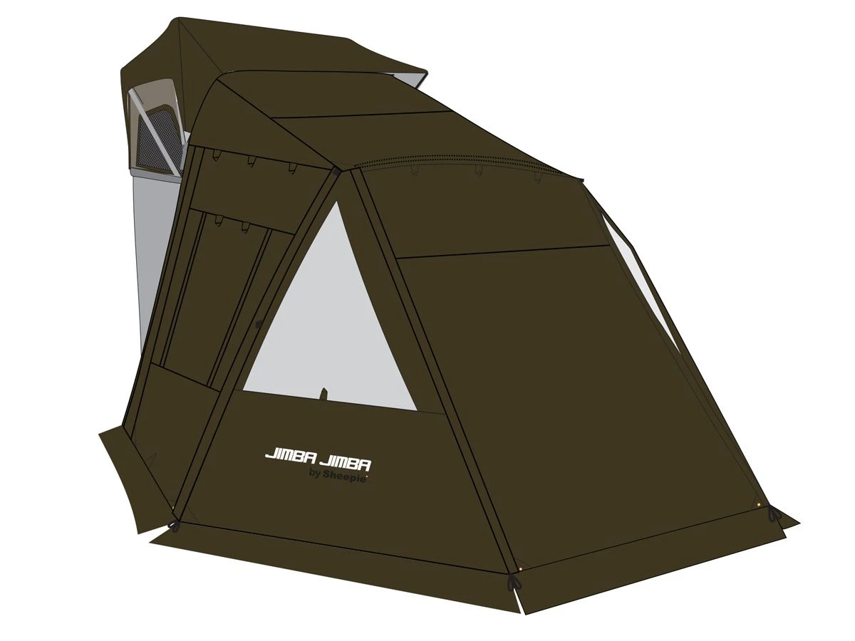 De Sheepie Jimba Jimba voortent groen is een praktische voortent om het oppervlak van je Jimba Jimba daktent te vergroten. Bij slecht weer heb je een overdekte voortent die ruim genoeg is om een tafel en wat stoelen in te plaatsen. Bij mooi weer kunnen beide zijwanden en de voorwand opgerold worden.