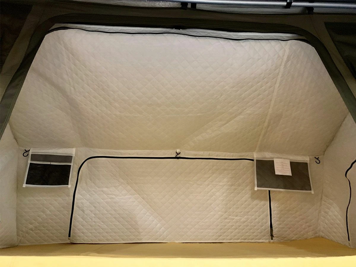 De thermo binnentent wordt met klittenband bevestigd aan de binnenzijde van de daktent en kan blijven zitten wanneer deze ingeklapt is.