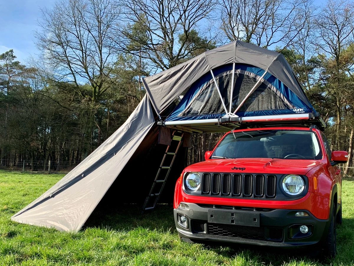 De Yuna Family Plus luifel wordt inclusief twee telescopische luifelstaanders, haringen en scheerlijnen geleverd.
