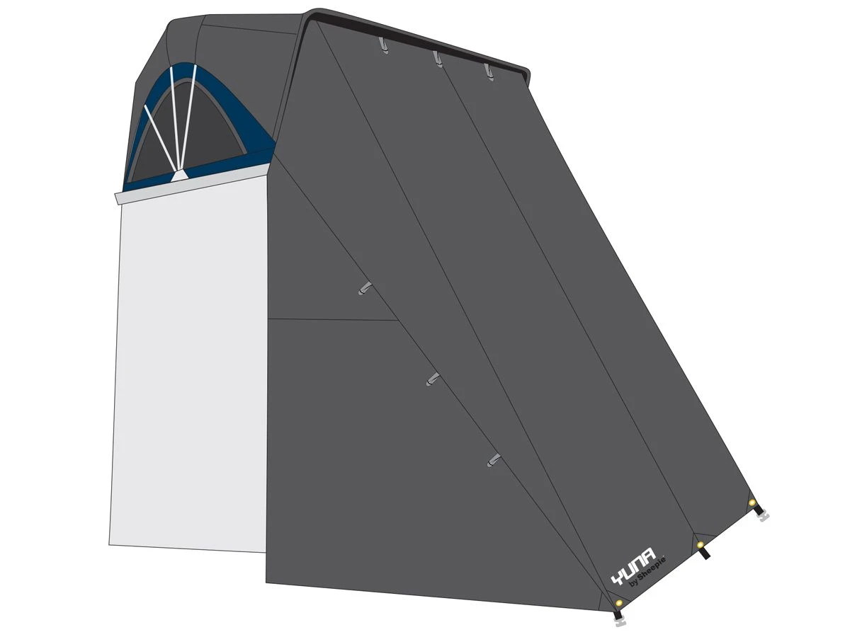 De Plus luifel voor de Sheepie Yuna Family een veelzijdige zonneluifel die ook als overdekt voorportaal opgesteld kan worden. Dankzij de oprolbare zijwanden kies je zelf hoeveel beschutting je nodig hebt. Door de plus luifel omhoog te zetten met de meegeleverde luifelstaanders ontstaat er een grote tarp waar je een overdekt terras mee kunt creëren..